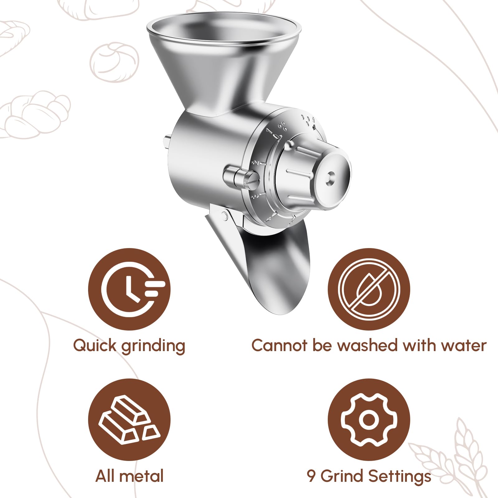 Versatile Grinding Option: Designed for KitchenAid mixers to grind a variety of dry grains into perfect powder. This mill grinder attachment for KitchenAid is especially suited for processing low-moisture grains such as wheat, oats, and corn (NOT for high-oil ingredients like nuts or sesame seeds), making it easy to create fresh flours, spice powders, and other kitchen essentials