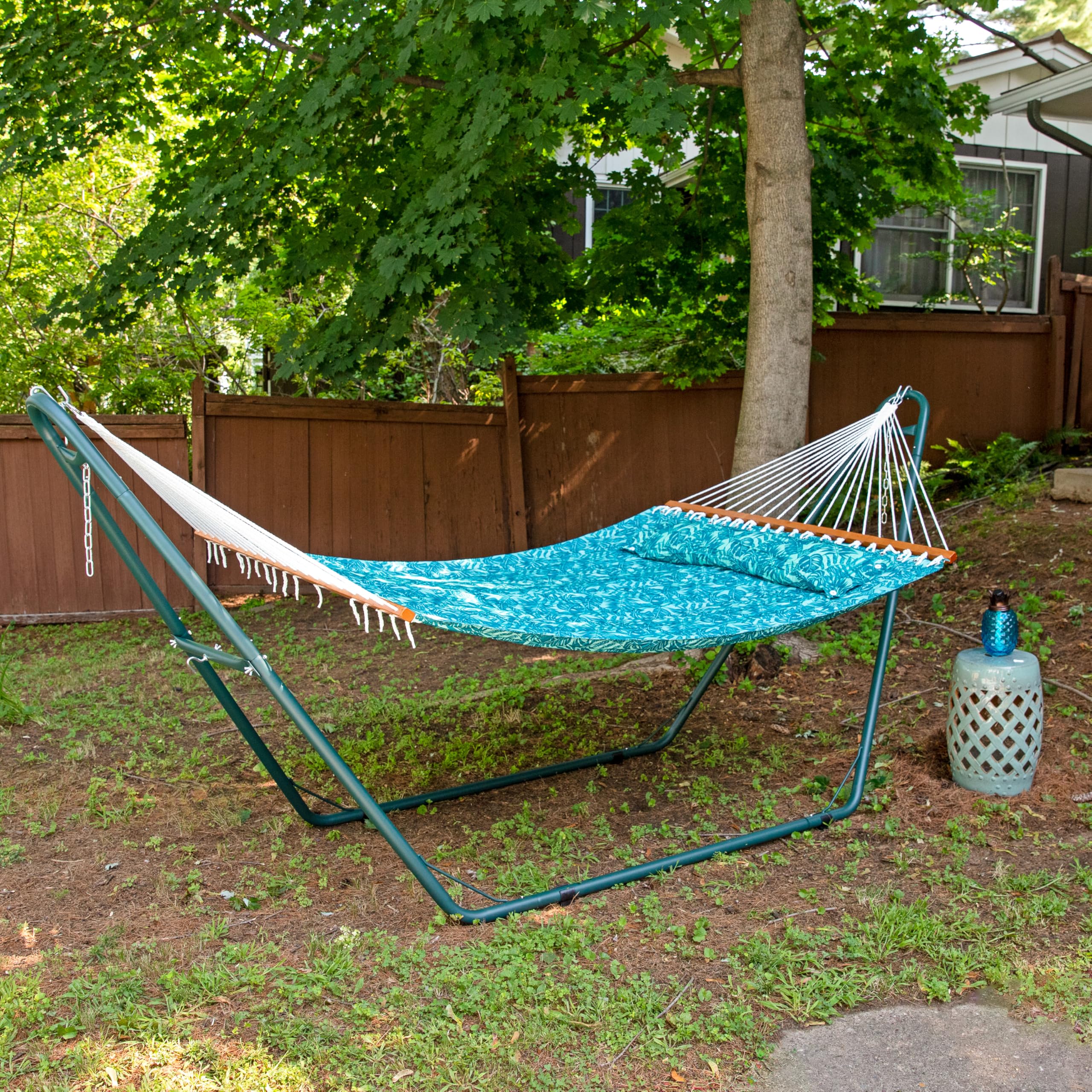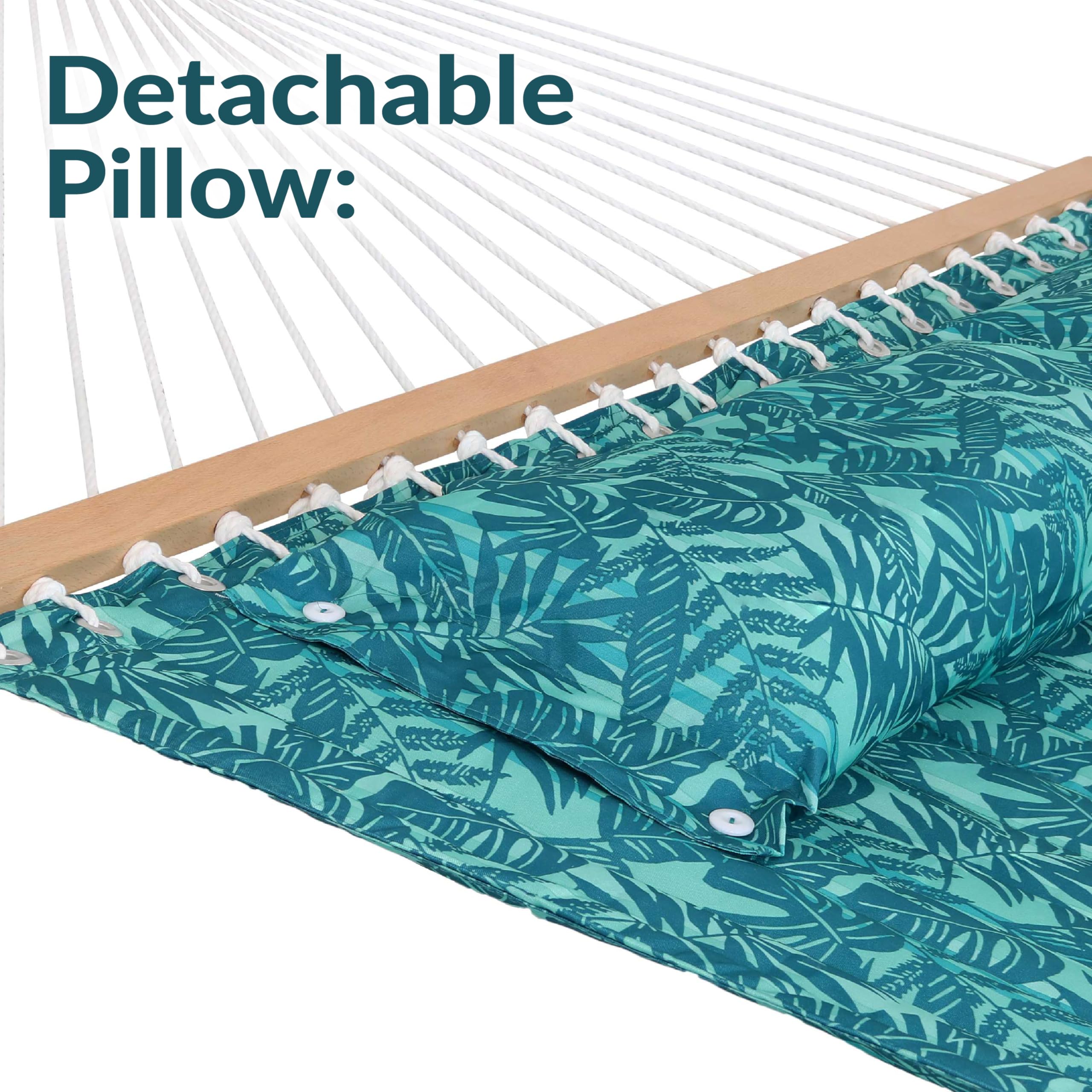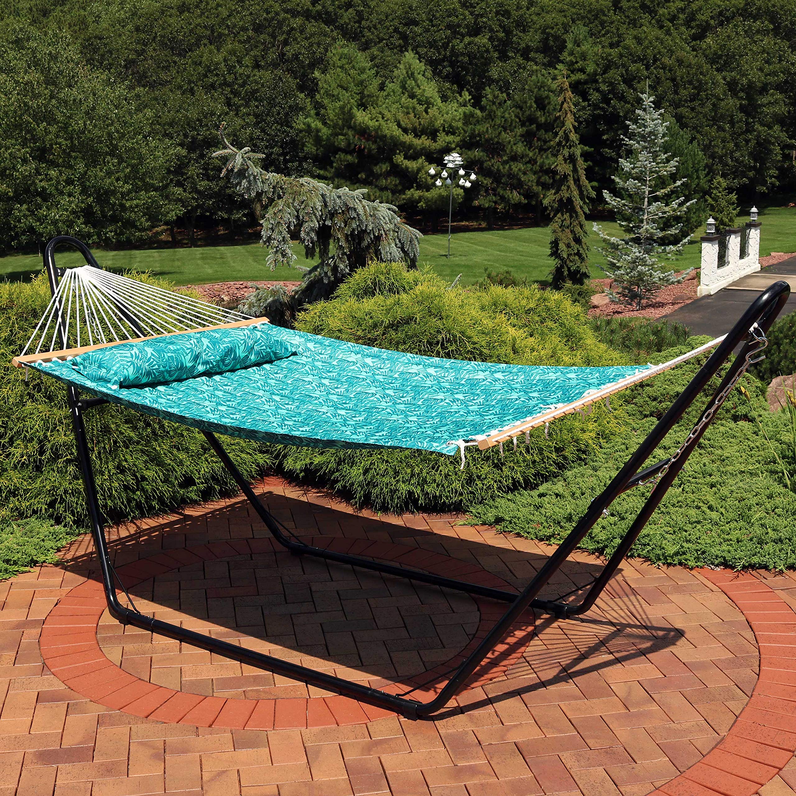 VERSATILE HANGING OPTIONS: The quilted hammock features attached chains for easy hanging. This two person hammock swing can be tied between trees, poles, or used with a 12' to 15' hammock stand (not included). It's wonderful for a variety of indoor or outdoor locations including the backyard, campsite, patio, sunroom, or bedroom.