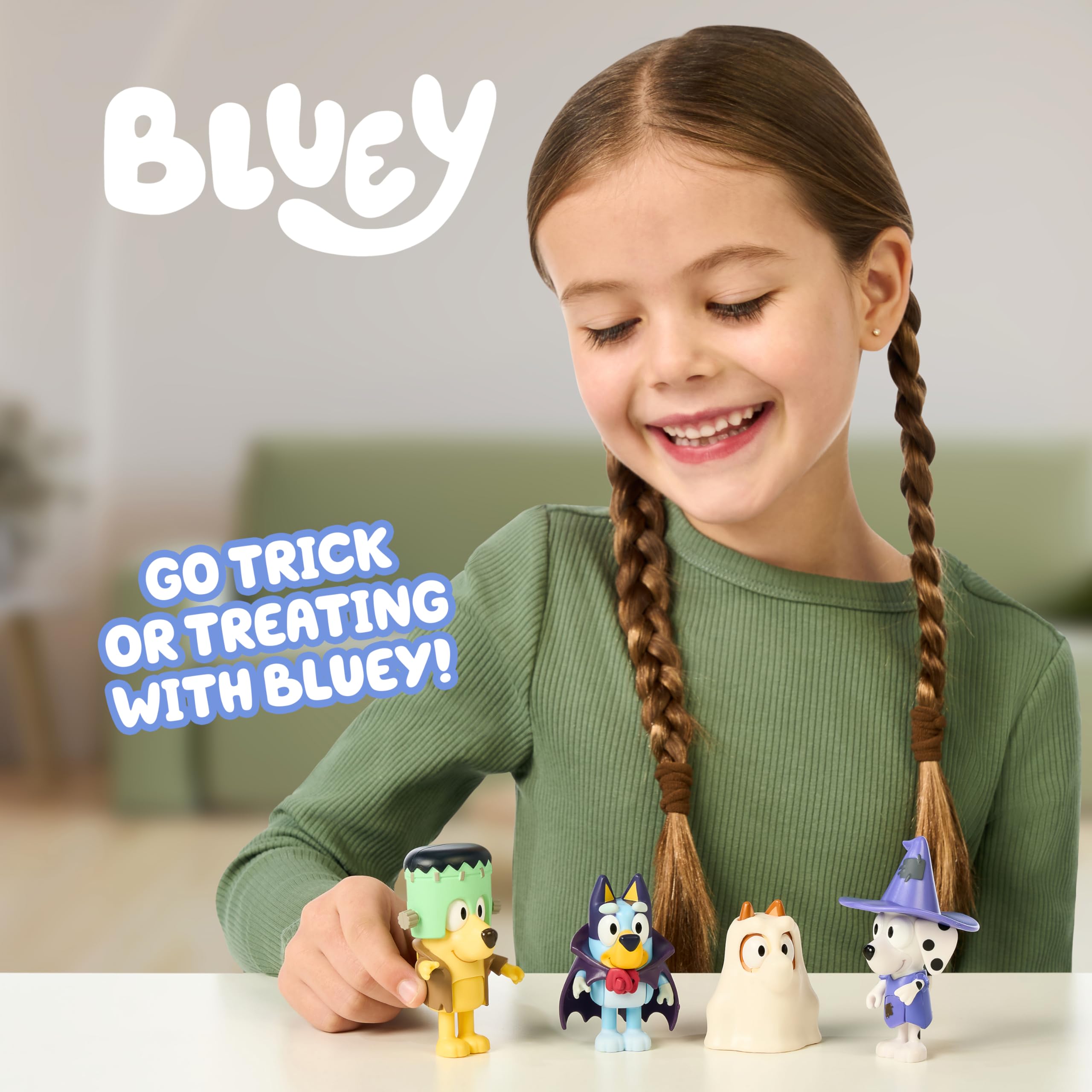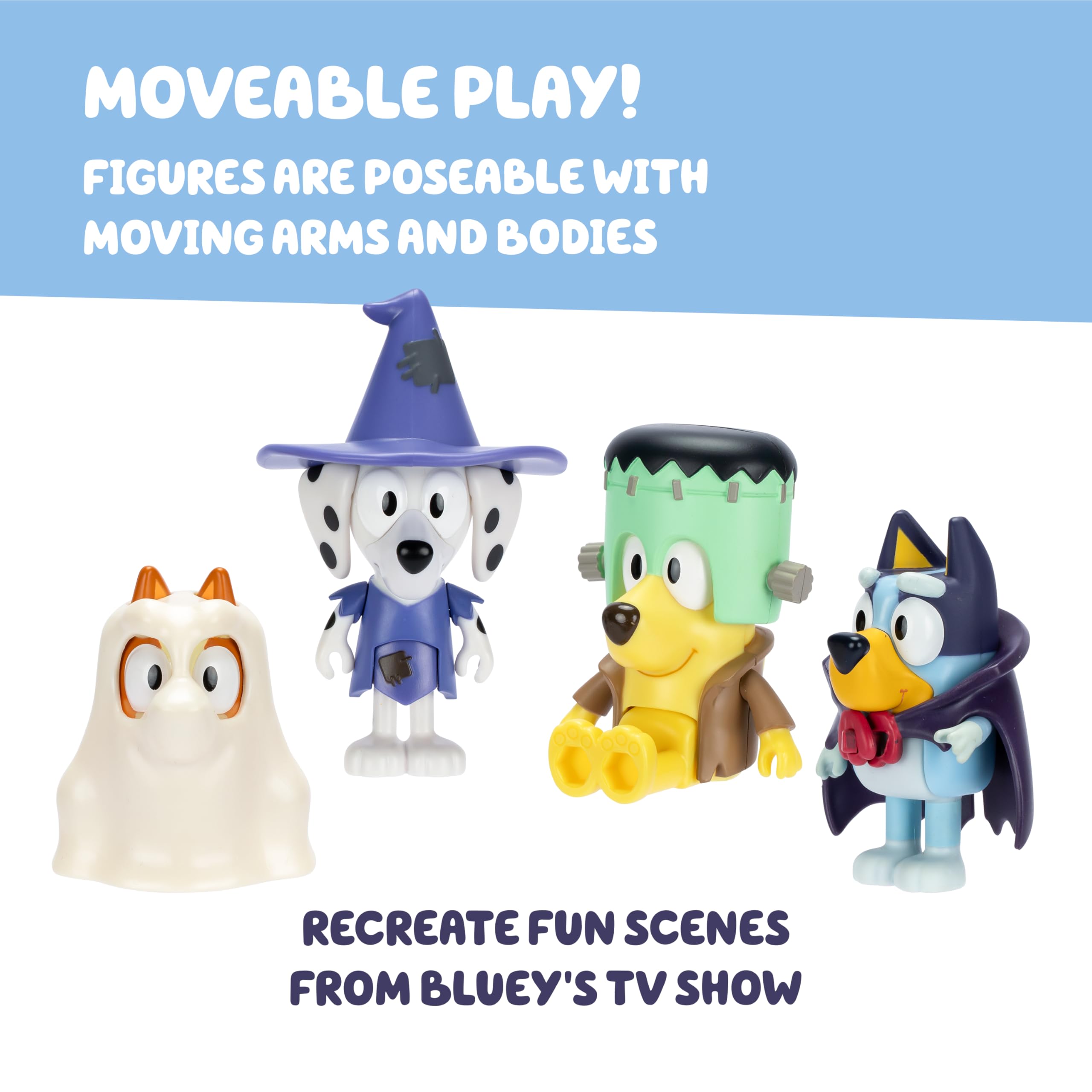 Bluey Halloween Pack: Bring home the fun of Bluey for trick or treating with our Bluey Halloween toys; this Bluey playset includes 4 Bluey Halloween character figures dressed up in spooky Halloween costumes, ready for every playtime adventure
