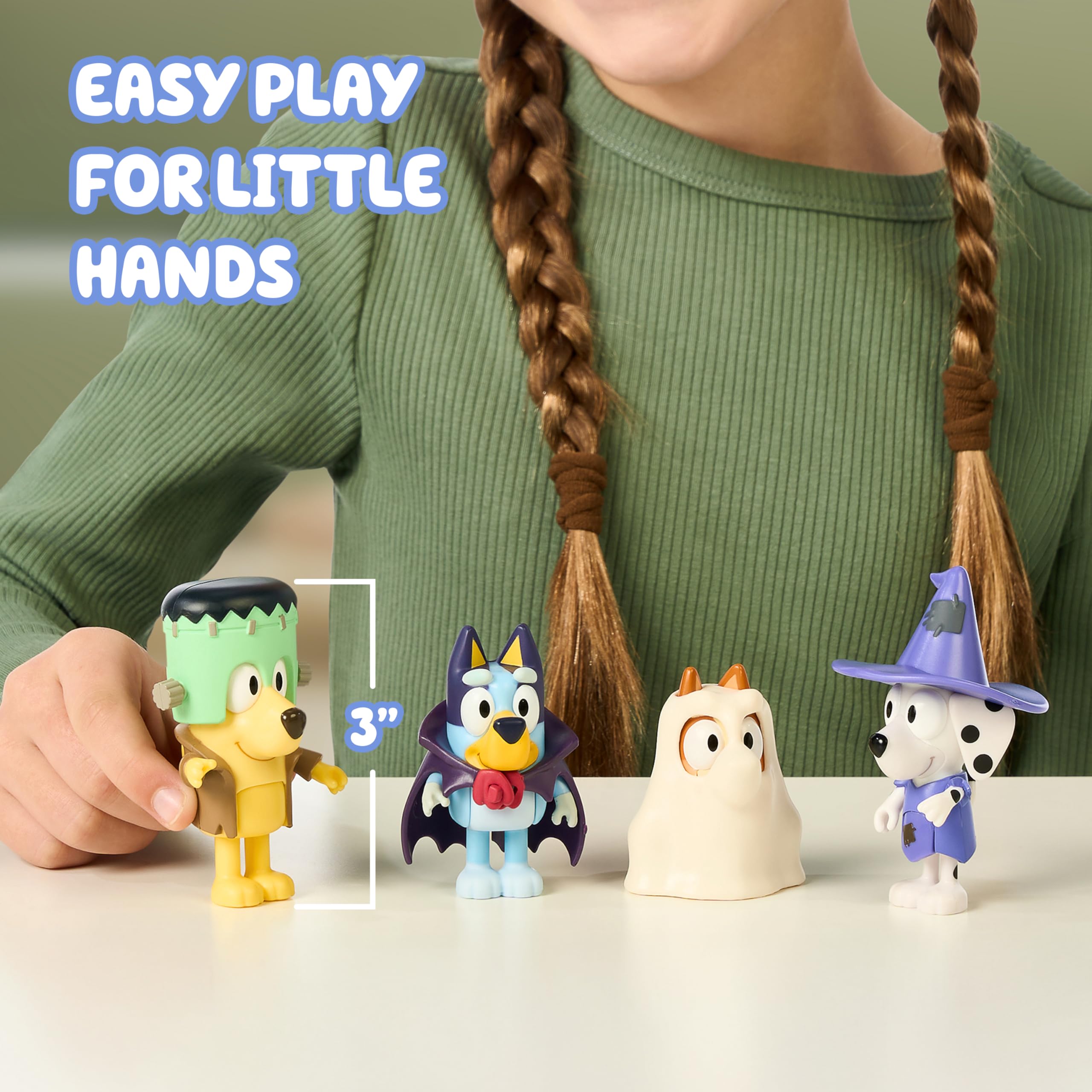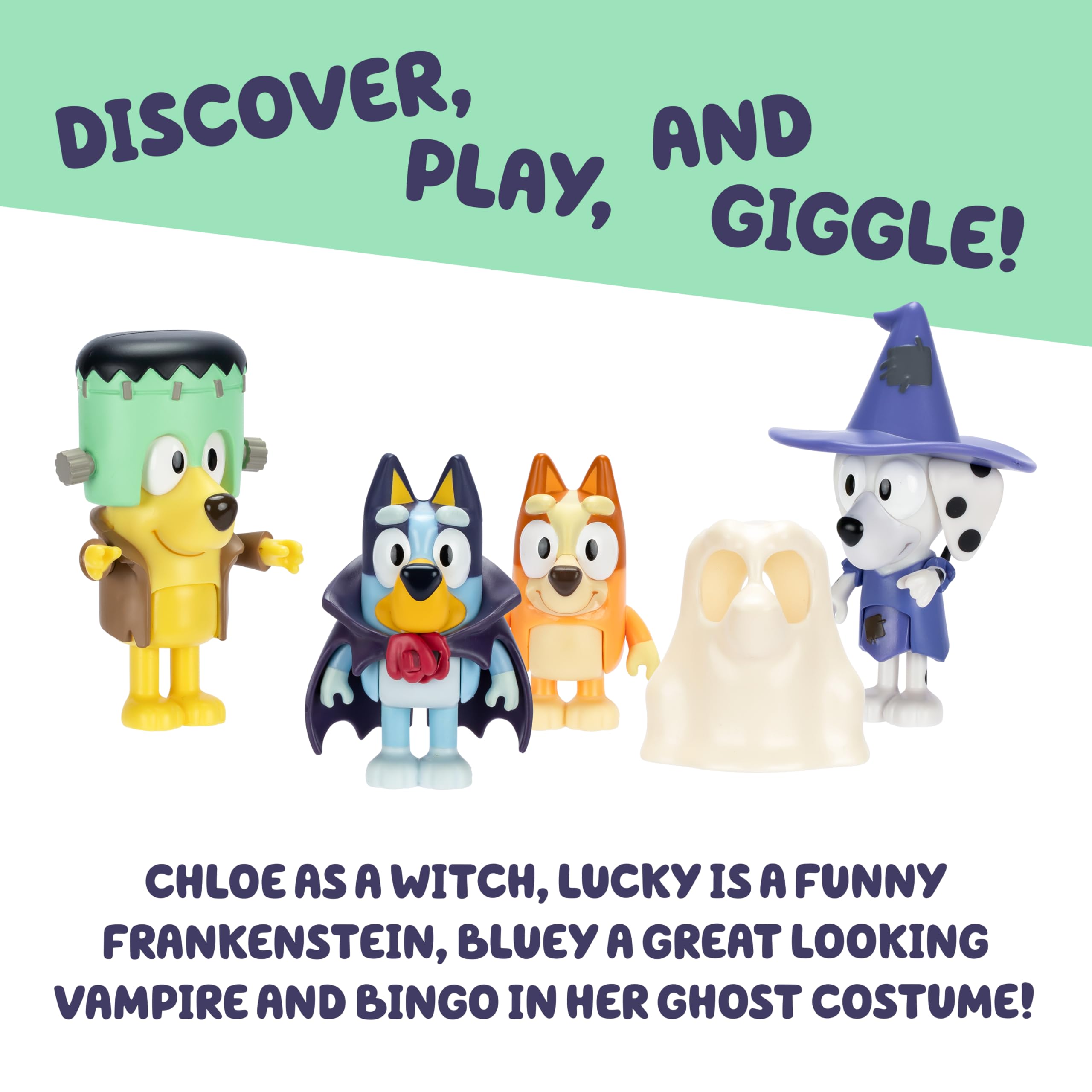 Immersive Design: Our Bluey figures set comes with Chloe as a witch, Lucky as a Frankenstein, Bluey as a vampire, and Bingo as a ghost; these Bluey toys for kids are perfect for encouraging immersive, action-packed pretend-play with fun accessories