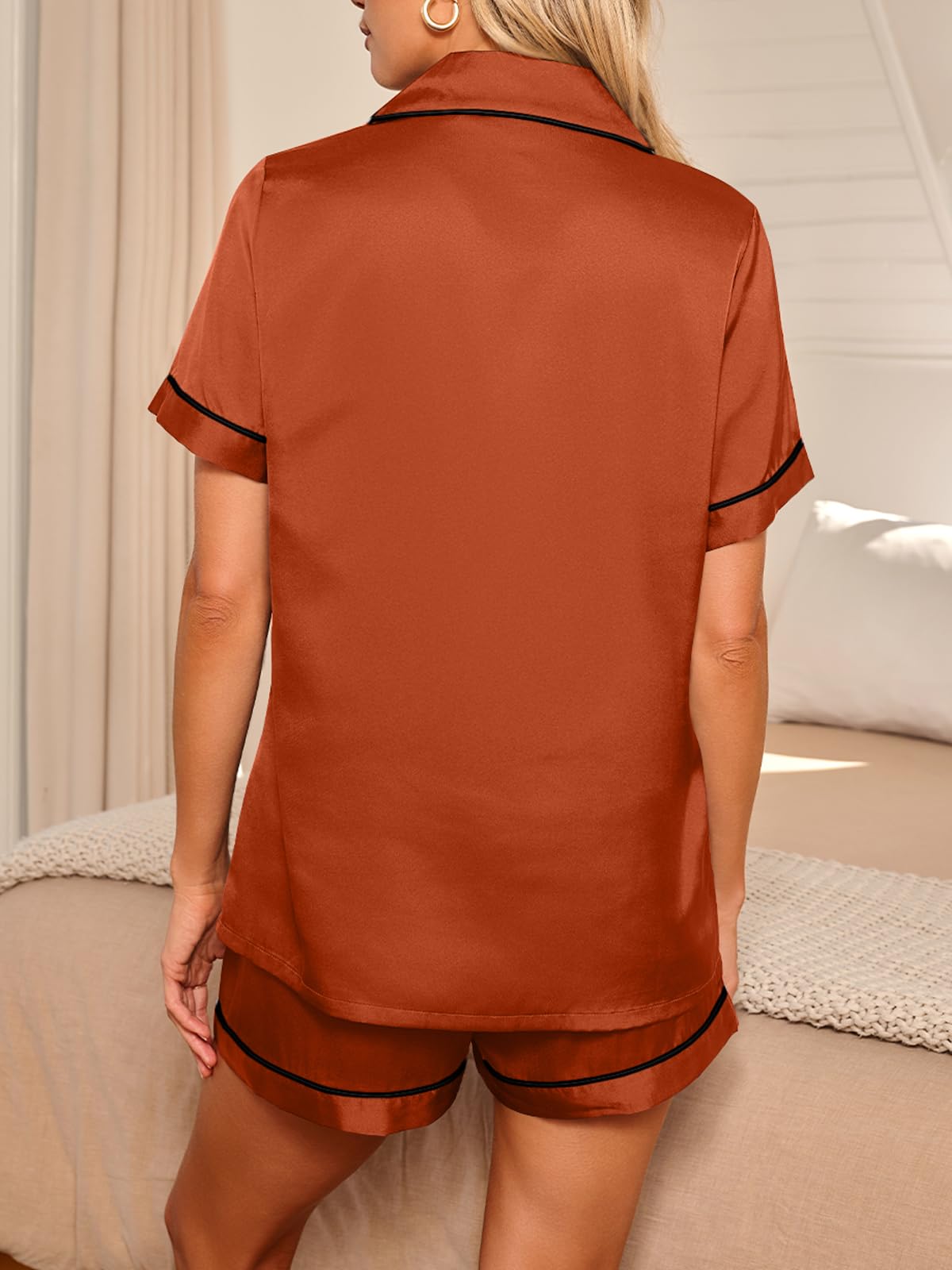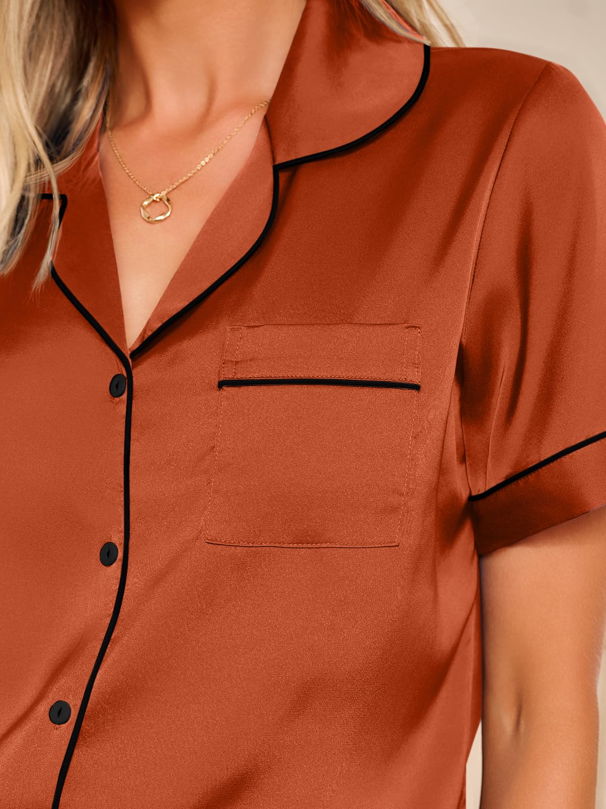 Pajama Top: Short sleeve sleepwear with notch collar,button front pajamas shirt and one chest pocket design.Lightweight and Skin-friendly silk pajamas for women.Great for sleeping,casual wear or lounging around the house or yard all day