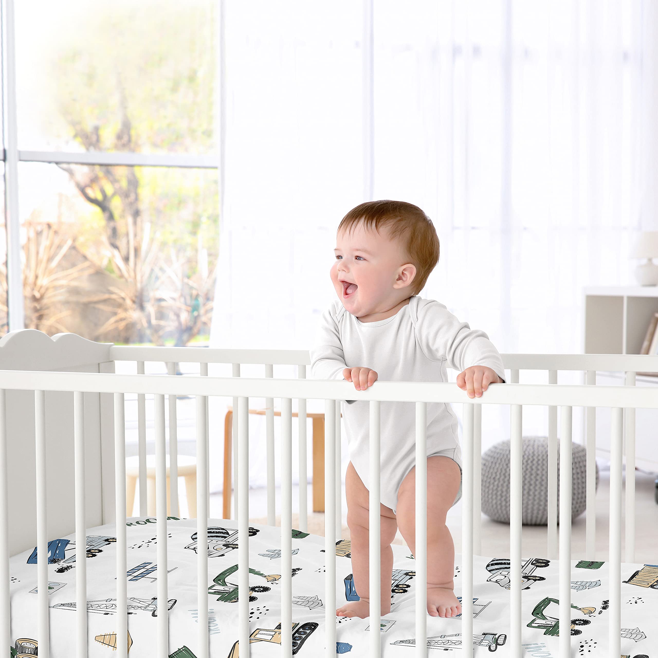 Pack of 2 Brushed Microfiber Fitted Crib Sheets - (1) Green Navy Blue Grey Yellow Construction Truck Transportation Bulldozer Tractor Cement Mixer Crane Print paired with (1) Grey and White Tire Tracks Print