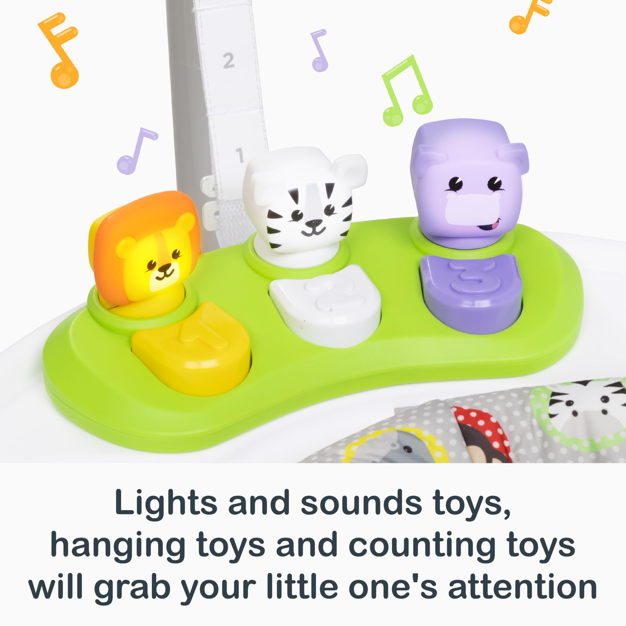 Lights and sounds toys, hanging toys and counting toys will grab your little one's attention and keep them interactive; toys are interchangeable amongst Smart Steps products for various playtime options