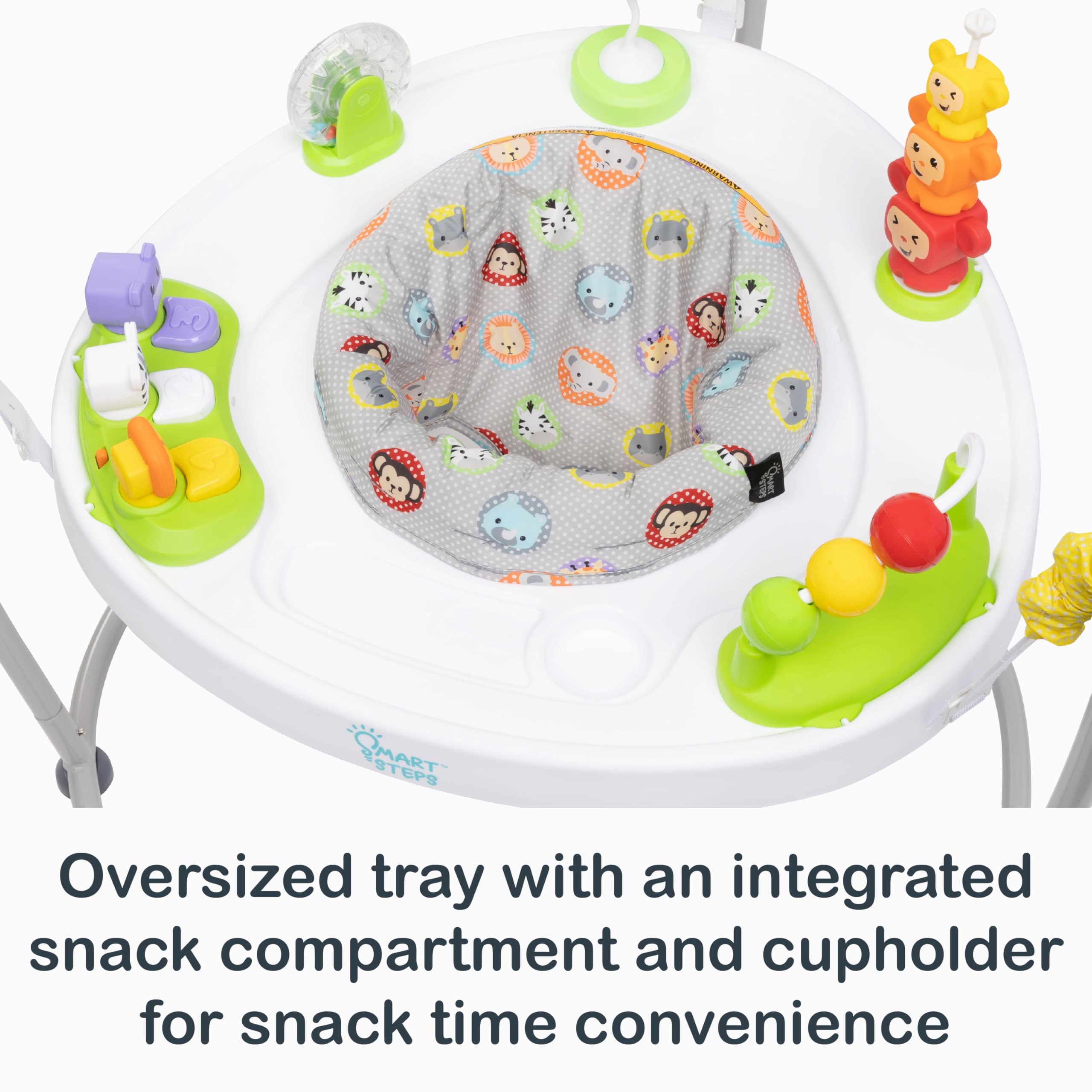 The Smart Steps® My First Jumper is the fun way to keep your little one active and busy! With a 360-degree tray and spinning seat, this jumper offers all around fun! My First Jumper offers seven different unique STEM toys to keep your child entertained while encouraging learning. These removable toys can be used as standalone toys and are also interchangeable amongst other various Smart Steps items. The oversized tray includes a snack compartment and cupholder for convenience during snack time. This jumper has various height adjustability options to grow with your child for extended use. For hassle-free cleaning, the seat pad is removable and machine washable. The sturdy yet slim frame will easily fit in any room in your home!