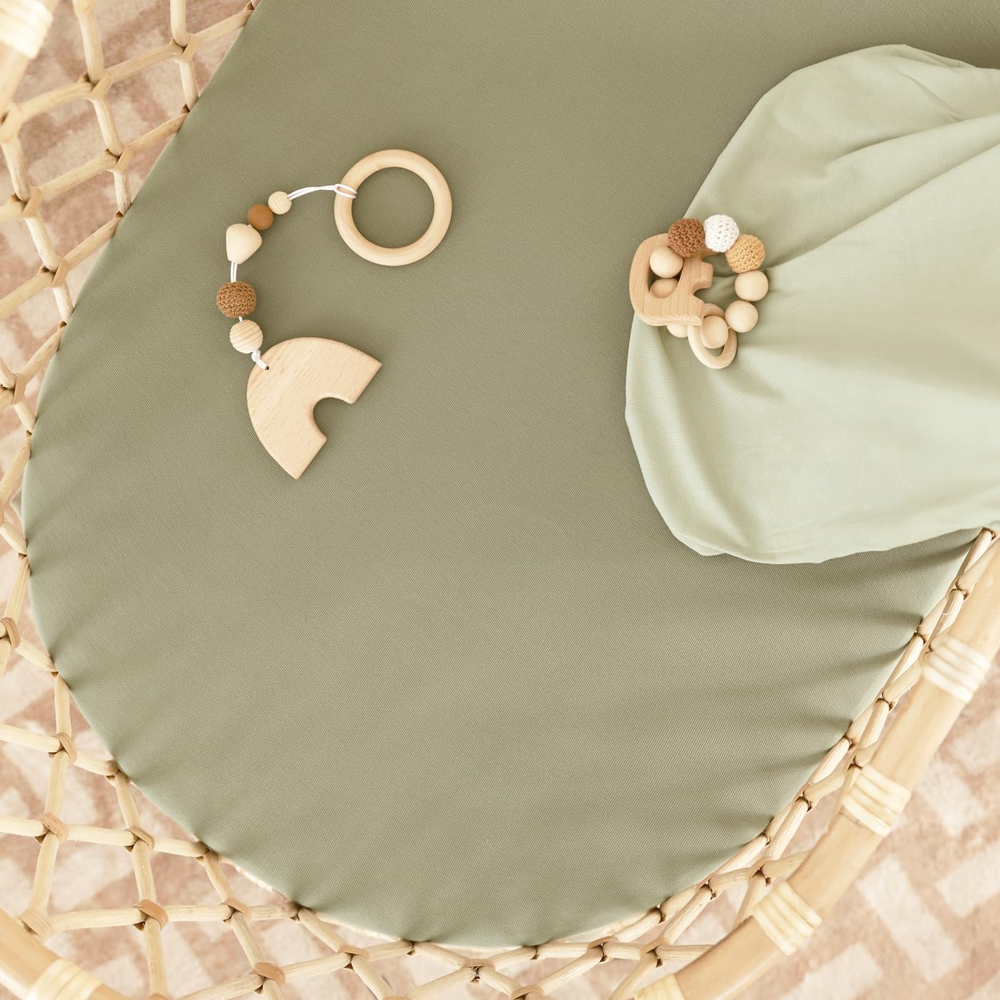 Universal Fit – Measuring 32" x 16" x 5". Our bassinet sheets fit almost all standard oval, round, rectangle, hourglass shaped bassinet mattresses and changing pads. Each bassinet mattress pad cover comes with an elastic band encased at the bottom for safety.