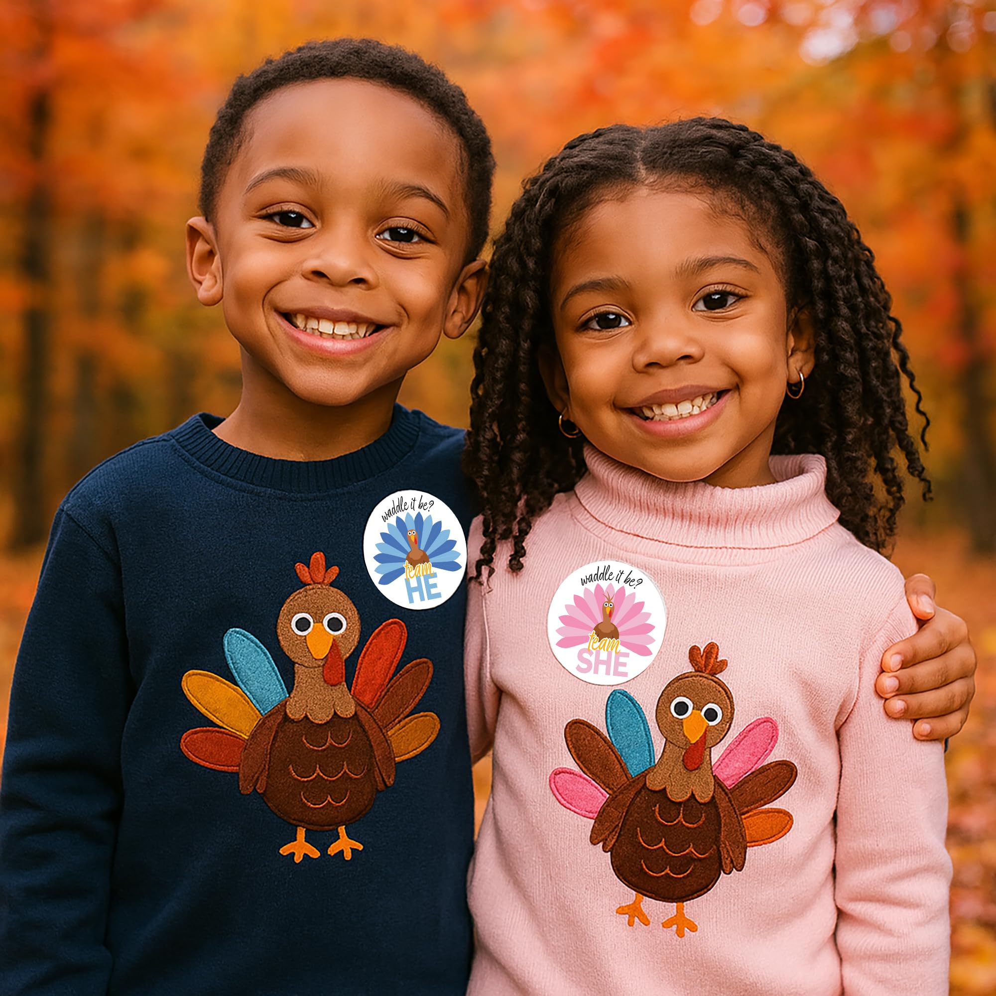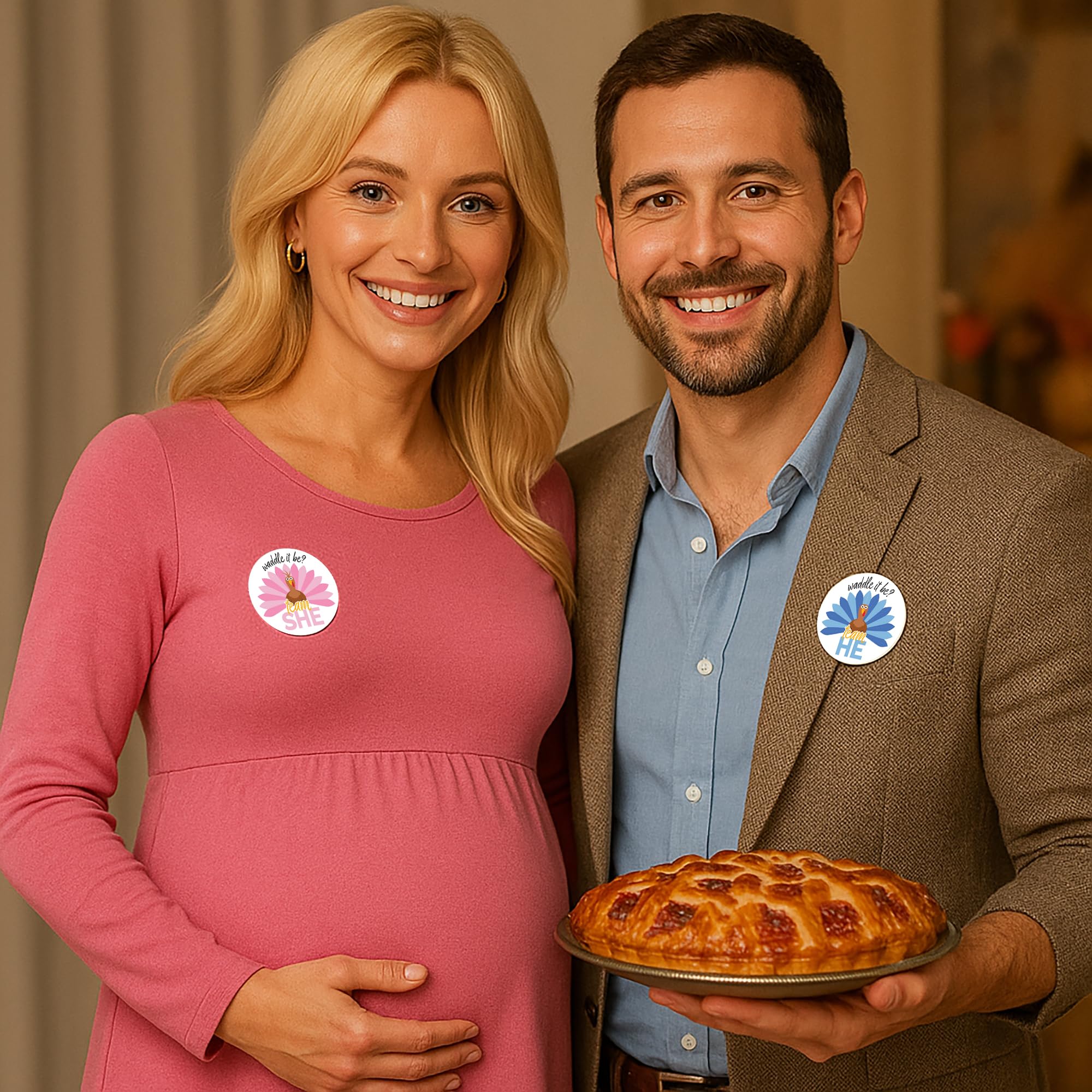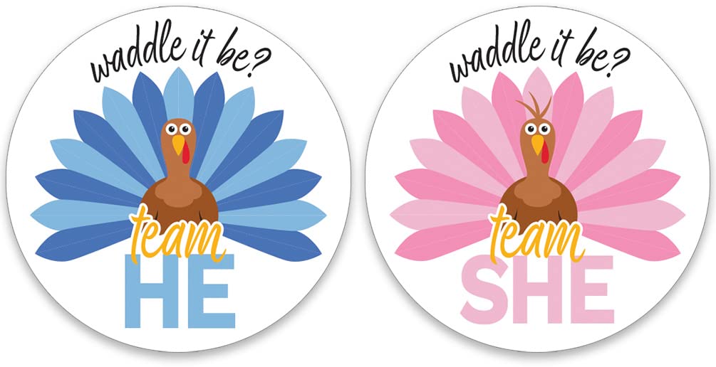 He or She? Add a little something extra to your Thanksgiving festivities by including a festive turkey day gender reveal. Have your friends and family take a shot at what your little turkey will be and choose blue team HE or pink team SHE stickers.