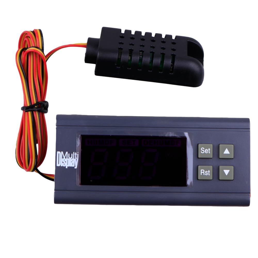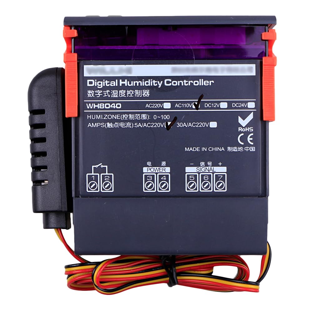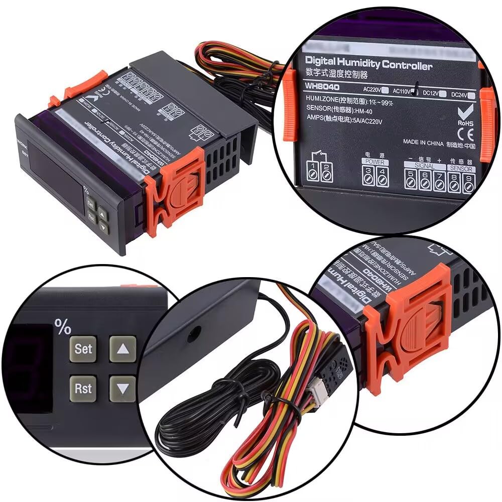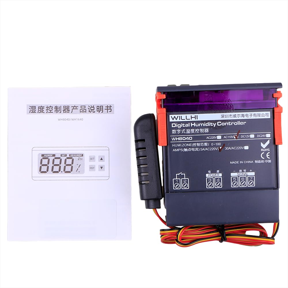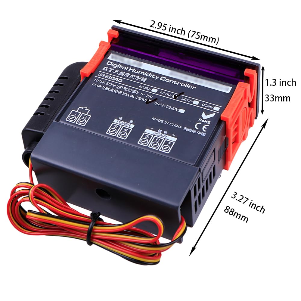 This digital humidity control controller WH8040 is with wide humidity measuring range and controlling range, comes with a humidity controller sensor probe with cable and a temperature sensor probe with cable. Humidity measuring range is 1% ~ 99% RH and control range is 1% to 99% RH. Features: Function of humidification and humidification. Hysteresis function. Humidity correction. Delay protection. Function of Upper and Lower limit. RST: Press key RST to switch satrting up and power off, on the condition of power off, it can start up when press key RST, on the condition of starting up, it can power off when press and hold the key RST for three seconds. SET: Press key SET to enter settings of humidity control, and press key ▲ or ▼ to adjust. Press and hold key ▲ or ▼ for three seconds to enter the fast adjust mode. Press key SET again to exit setting mode. Humidity correction. Don't hesitate, bid now and never miss it. You will receive a parcel contains as below. Specifications: Humidity Measuring Range: 1% ~ 99% RH. Humidity controlling range: 1% ~ 99% RH. Humidity Measuring Error: 3%. Resolution: 1% RH. Sensor Type: HM-40. Power Suppler: AC 110V. Current: MAX 200MA. Data retention: YES. Power consumption: <3W, Max 200mA. Relay contact current: AC 5A/110V. Temperature compensation: YES. Data Retention: YES. Working temperature: 0°C - 50 °C. Storage temperature: -10°C - 60 °C. Size(L x W x H): Approx. 83 x 75 x 33mm. Probe size(D x L): Approx. 4 x 20mm.