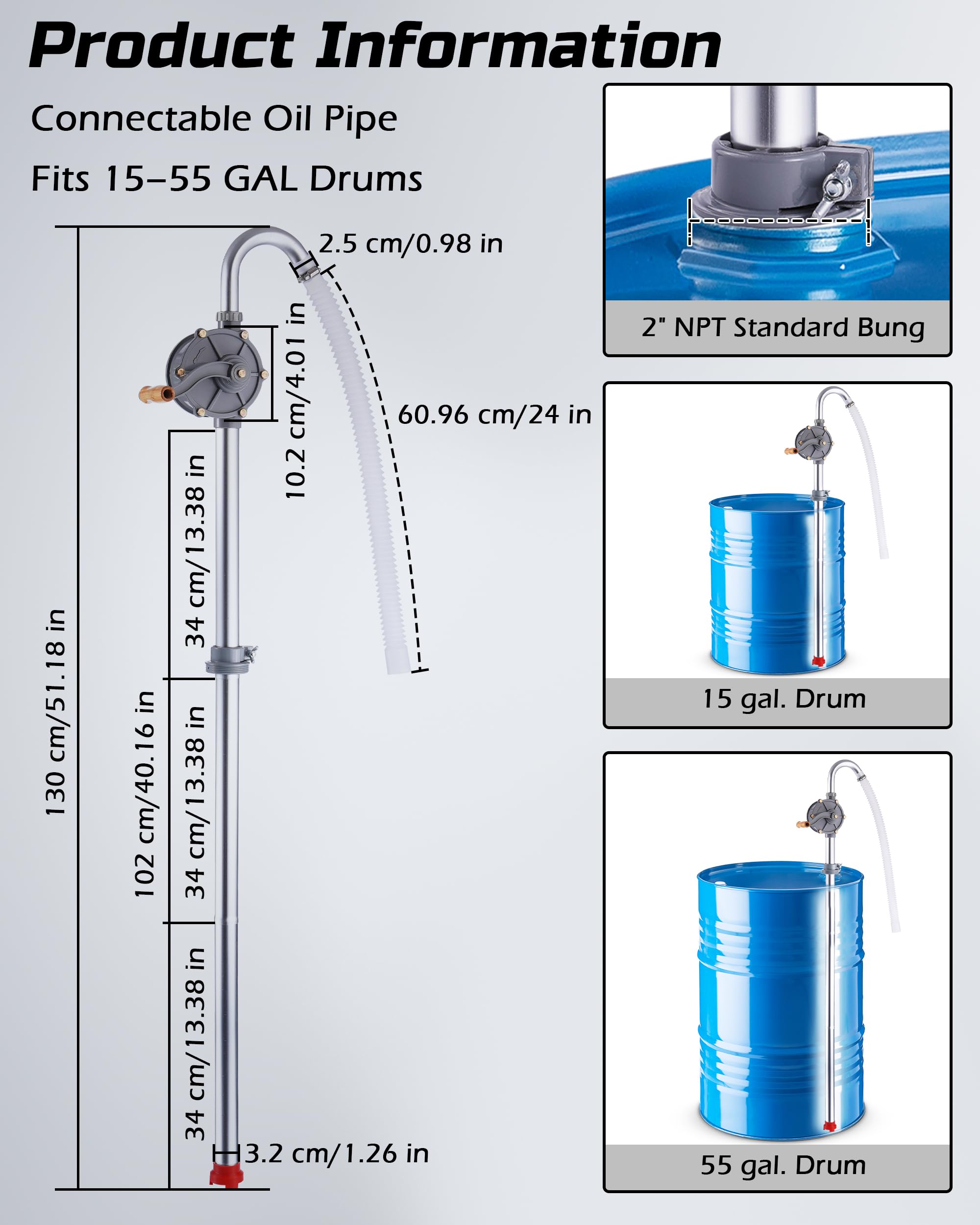 Fits 5–55 Gallon Drums: Three-section telescoping tube easily adjusts to fit different drum sizes — simple, secure, and convenient to use.