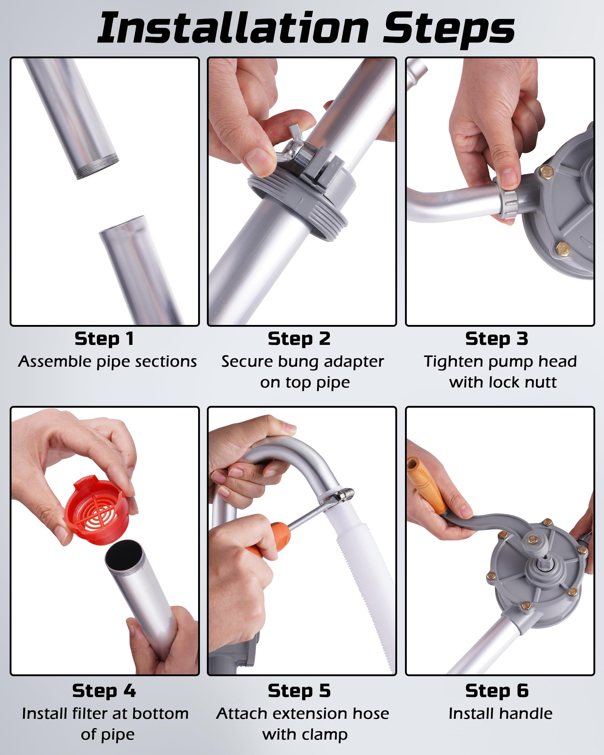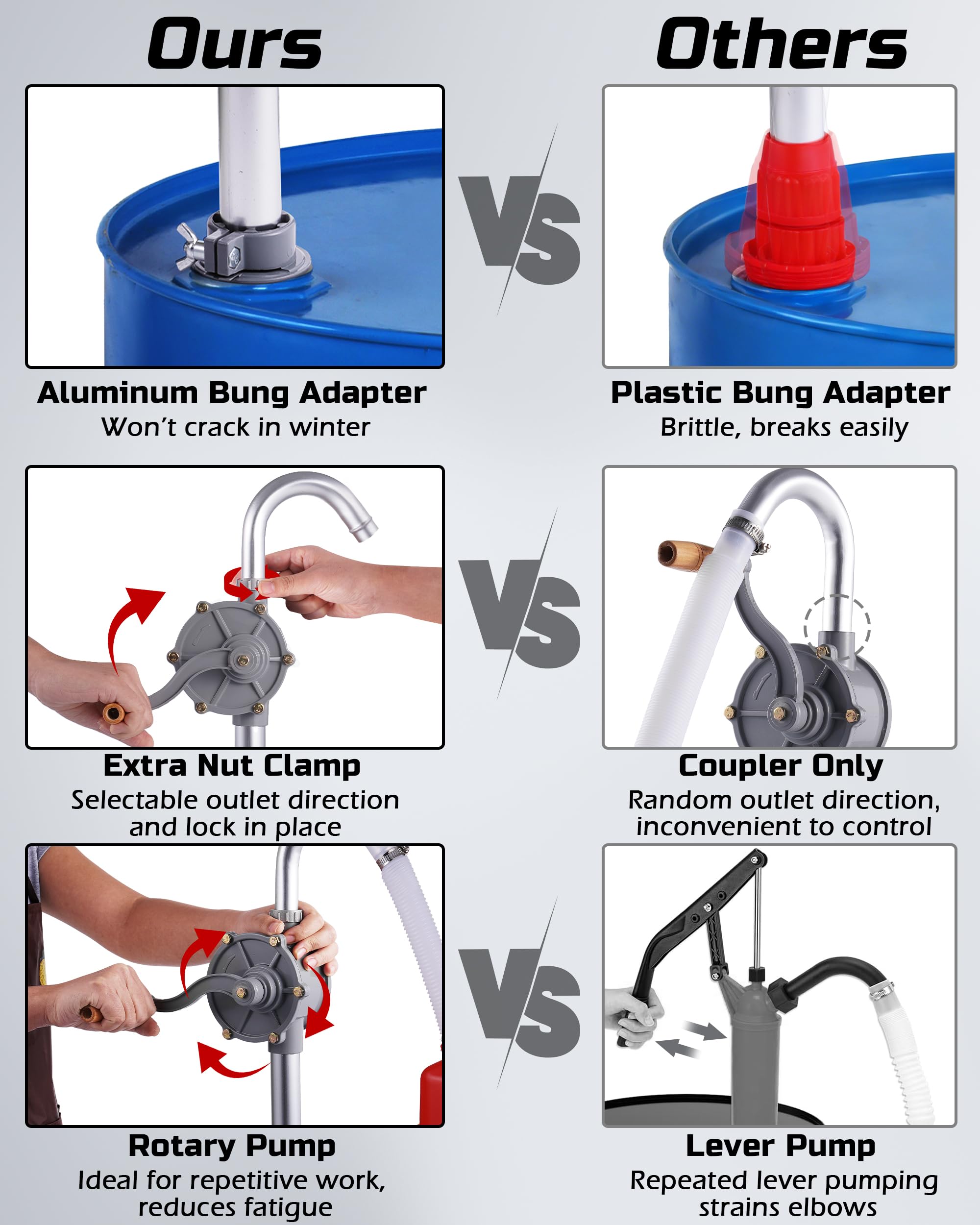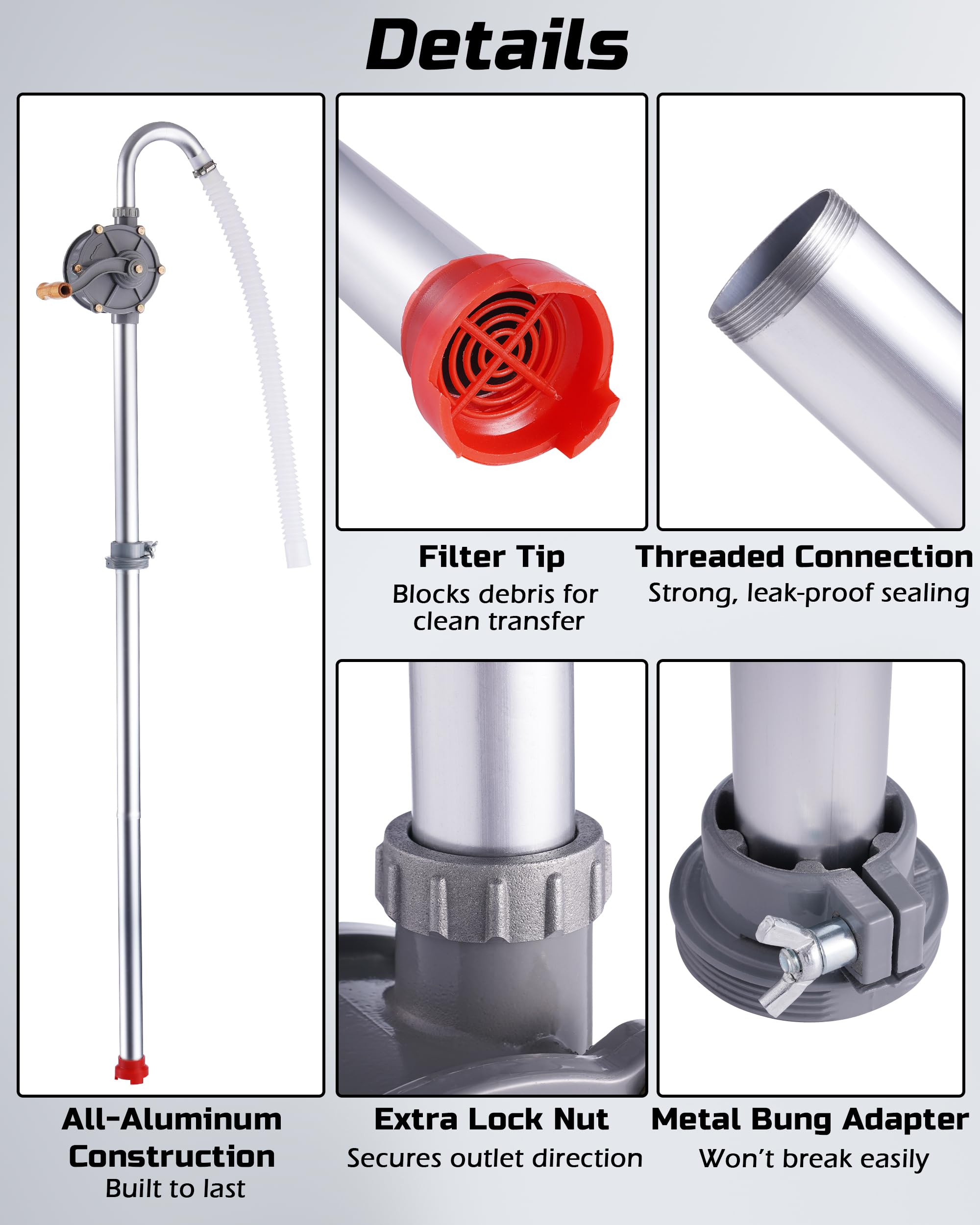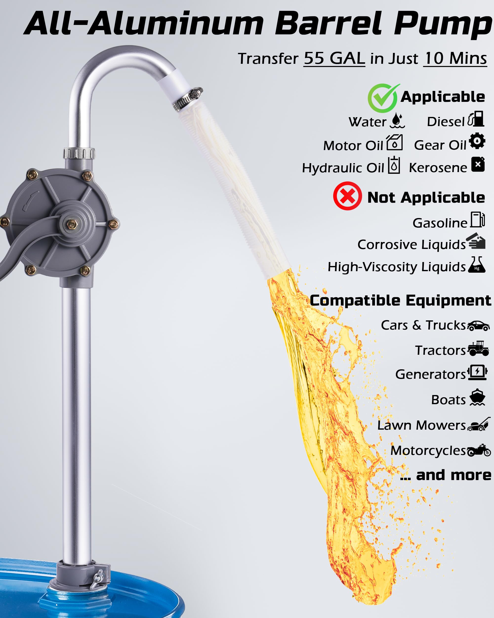 Built to Last: This 55 gallon drum pump features an all-aluminum body and fixing buckles that won’t break easily — perfect for daily use on the farm, in the shop, or in the field.