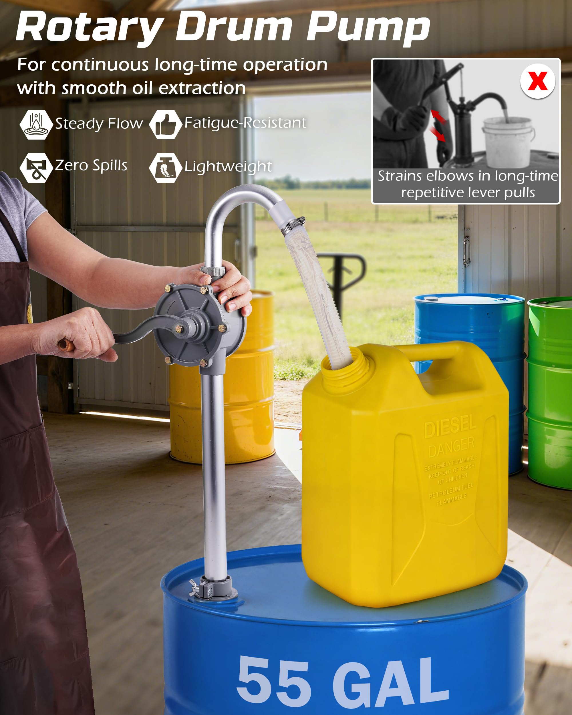 Smooth Rotary Operation: The rotary barrel pump delivers faster, steadier flow than lever-style pumps, minimizing arm fatigue during long transfers.
