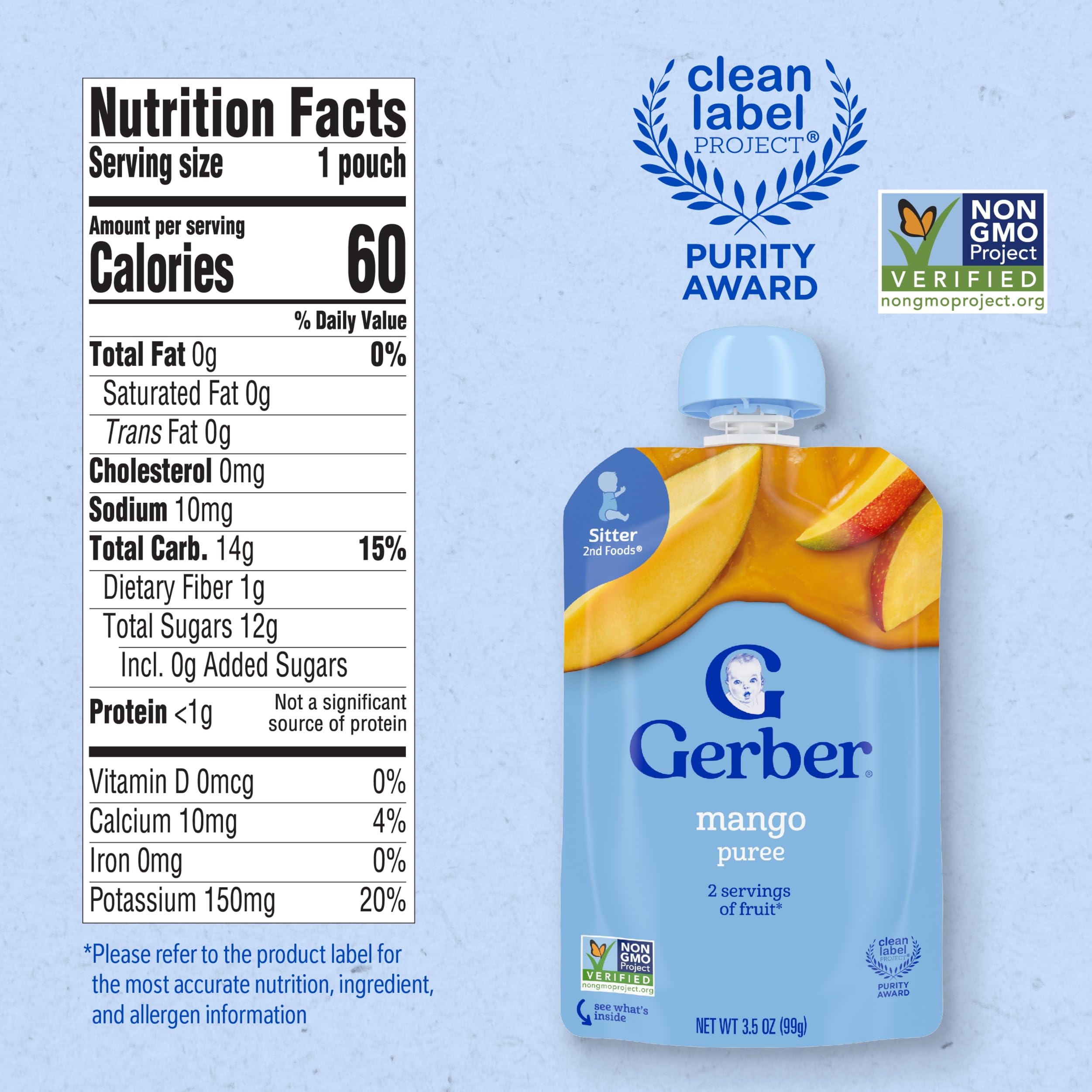 CONVENIENT BABY FOOD: Our Gerber Mango Puree Pouch is designed for ease and convenience. This Gerber baby food is portable, re-closeable and easy-to-store, for busy parents