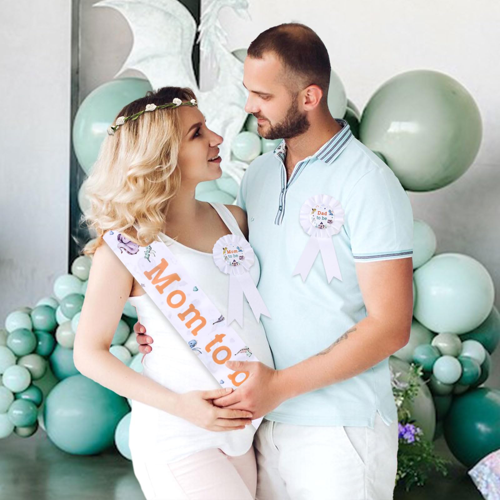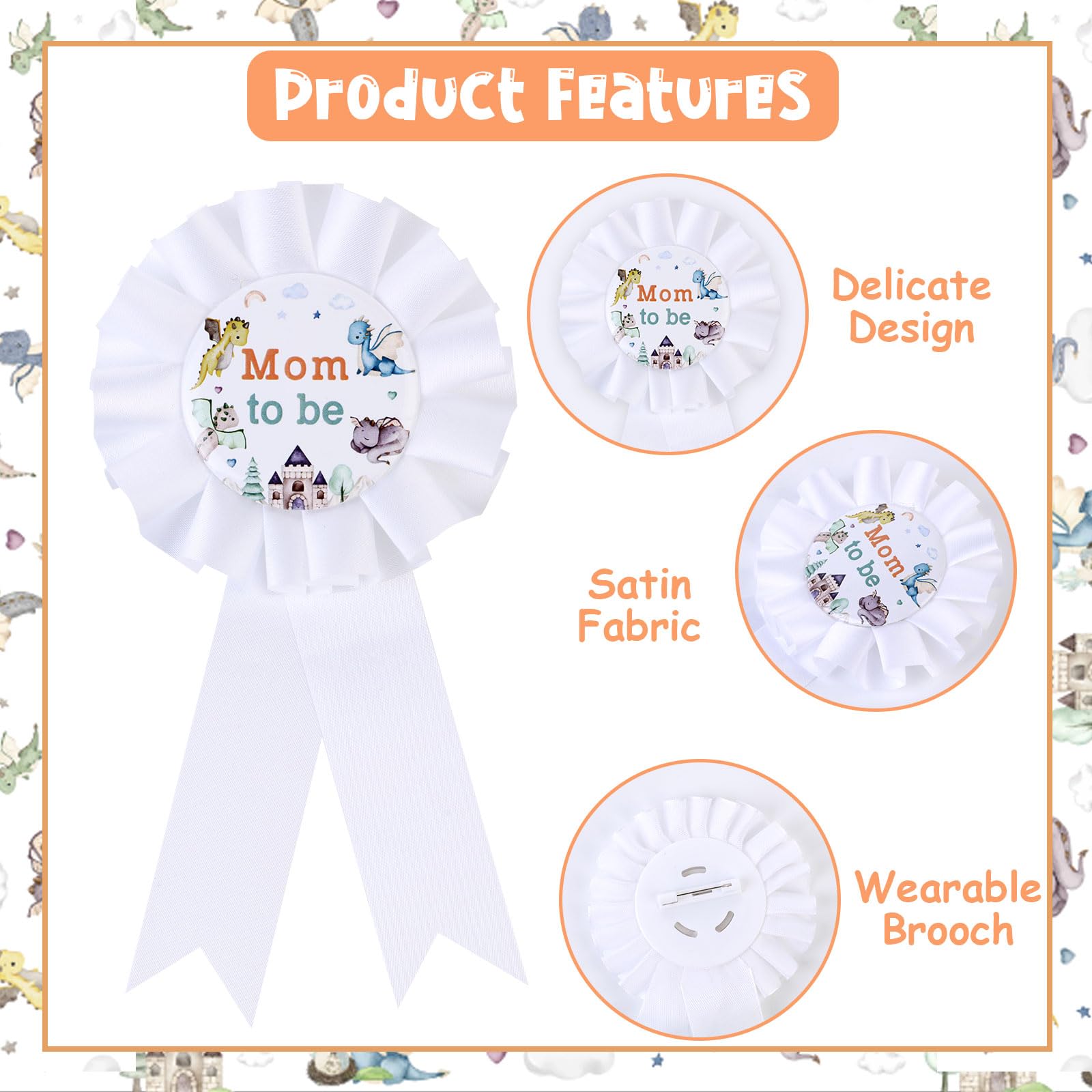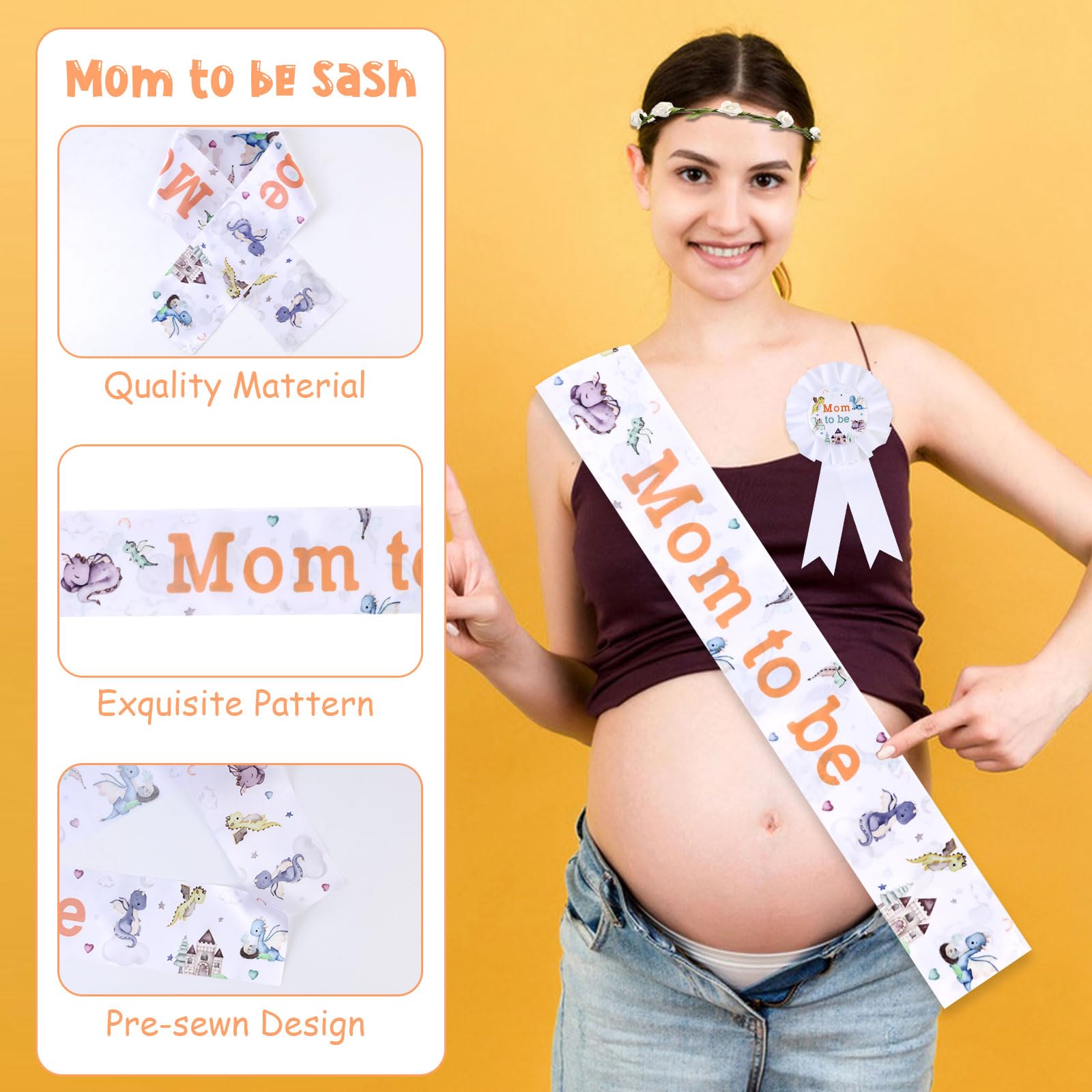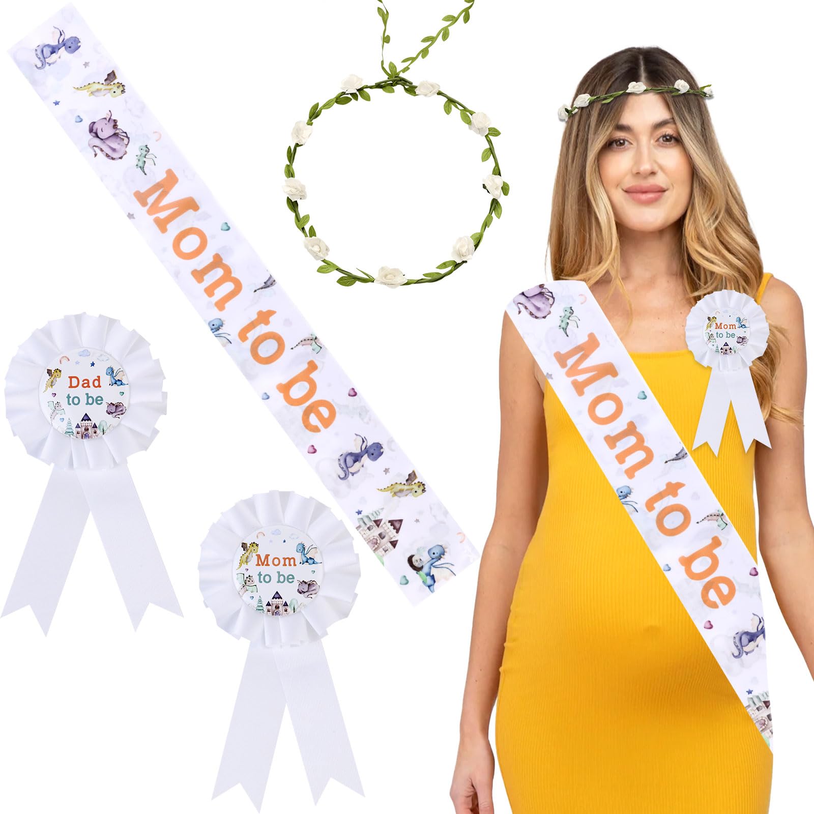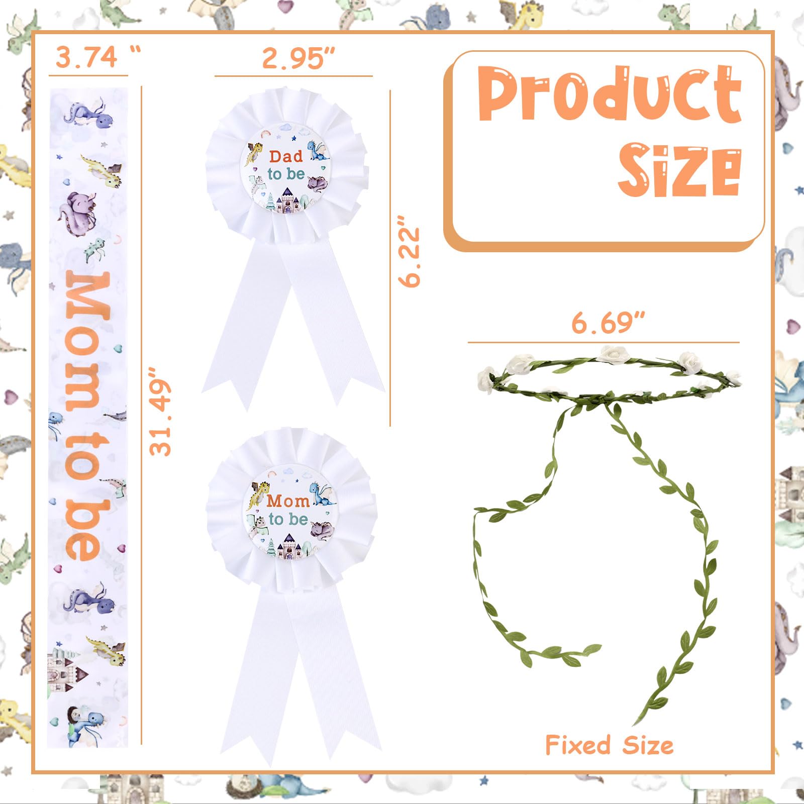 Dragon Baby Shower Decorations: It includes 1 baby shower dragon mom to be sash, 2 mom dad to be dragon pin and 1 flower crown headband, complete set for your requirements of baby shower decorations, perfect choice for celebrating a little dragon is on the way