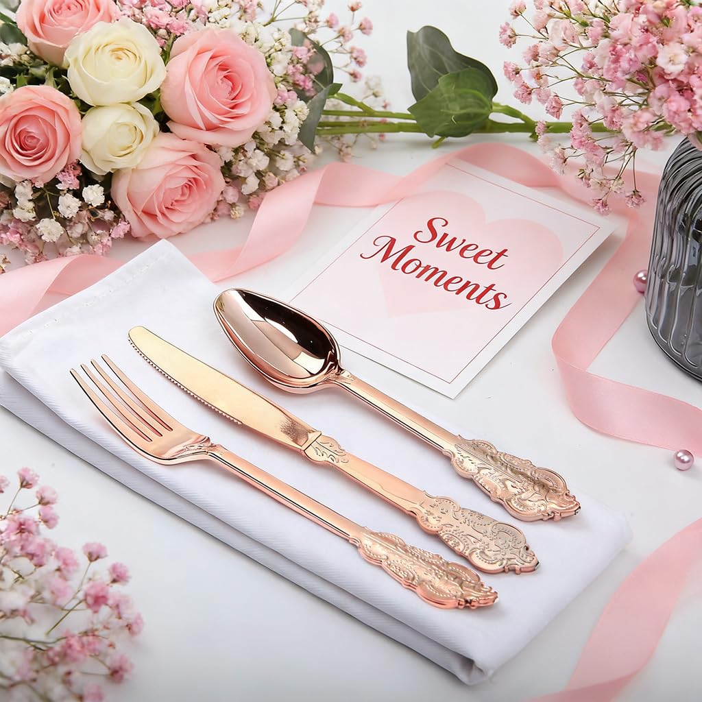 BEAUTIFUL DESIGN: Our plastic cutlery set includes 100 forks, 100 spoons and 100 knives β Lustrous rose gold cutlery gives you an elegant look that sets you all from business meetings to birthday parties including all your formal and informal events.
