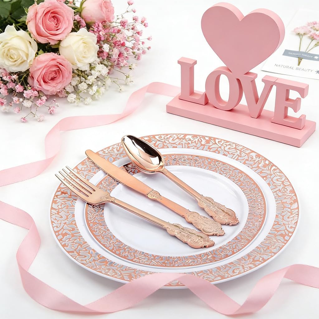 PREMIUM QUALITY: 100% food grade, non-toxic, BPA-free plastic! Those rose gold silverware is safe you and your guests. Solid, durable, heavy duty cutlery ensure won't scratch or break easily.