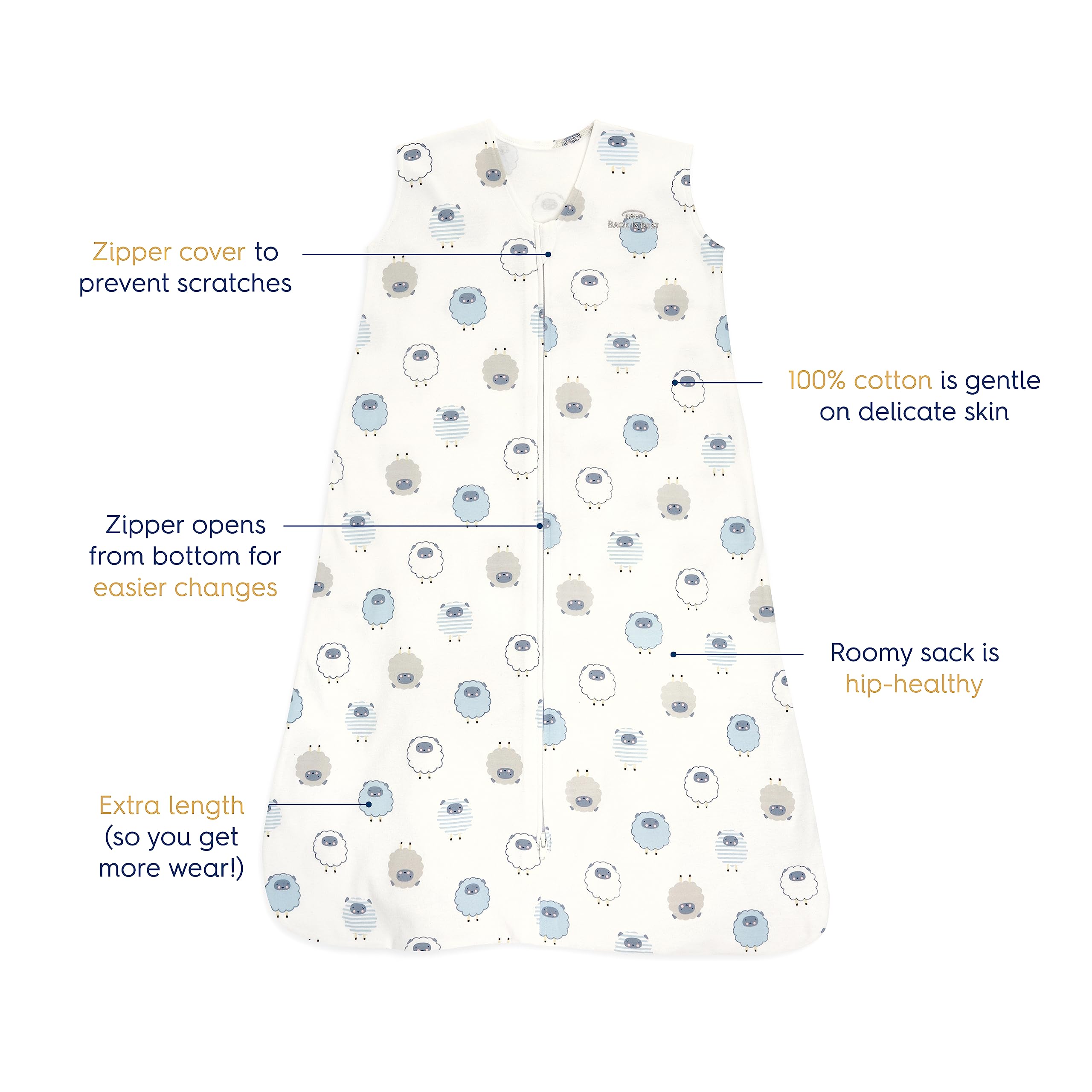 CONVENIENT DIAPER ACCESS: Features a bottom-opening zipper for easy diaper changes, a comfy neckline with a zipper cover to prevent scratches, and an extra-long, roomy sack to support healthy hip development and reduce frequent sizing up.