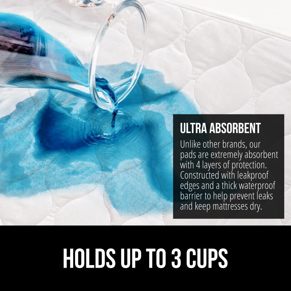 LEAK PROOF PROTECTION: 2 pack; our pad can hold up to 8 cups of liquid, much more than others; moisture is quickly absorbed into the pad and then dispersed throughout, helping to prevent leakage; also features leak proof edges, resilient inner layers and a thick waterproof barrier to offer additional, unparalleled protection that will give you the comfort and security you need