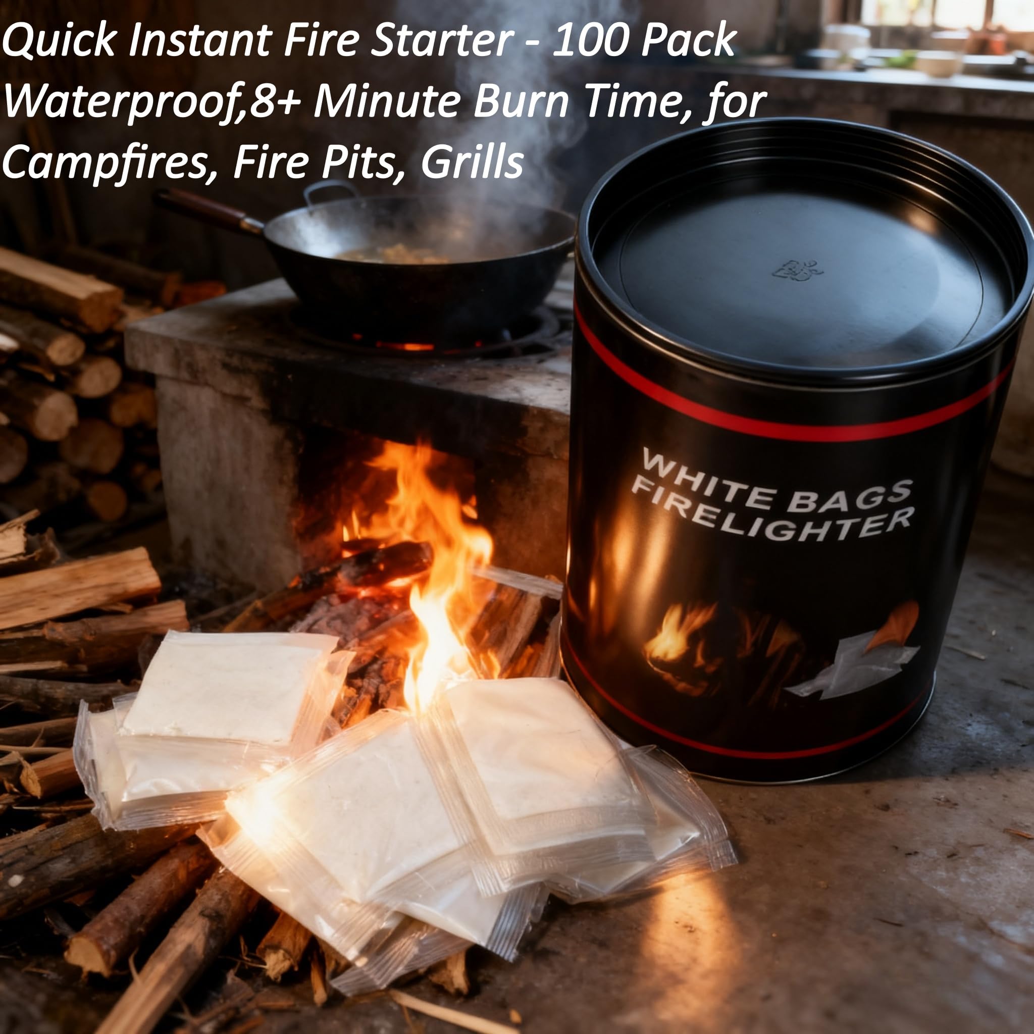 Light up your outdoor adventures and indoor comfort with these WHITE BAGS fire starter cups. Each pack contains 100 reliable wax-based fire starters that provide consistent performance in various settings. These innovative cups deliver an impressive burn time of up to 8 minutes while reaching temperatures of 750°C, making them perfect for lighting charcoal grills, campfires, fireplaces, and wood stoves. The waterproof design ensures they remain effective even in challenging weather conditions, giving you peace of mind during outdoor activities. Whether you're planning a BBQ, setting up camp, or preparing your fireplace for a cozy evening, these fire starter cups offer a convenient and reliable solution. Their compact size makes them easy to store and transport, while their powerful performance helps you start fires quickly and efficiently. Ideal for both everyday use and survival situations, these fire starter cups are a must-have addition to your outdoor gear or home fire-starting supplies.