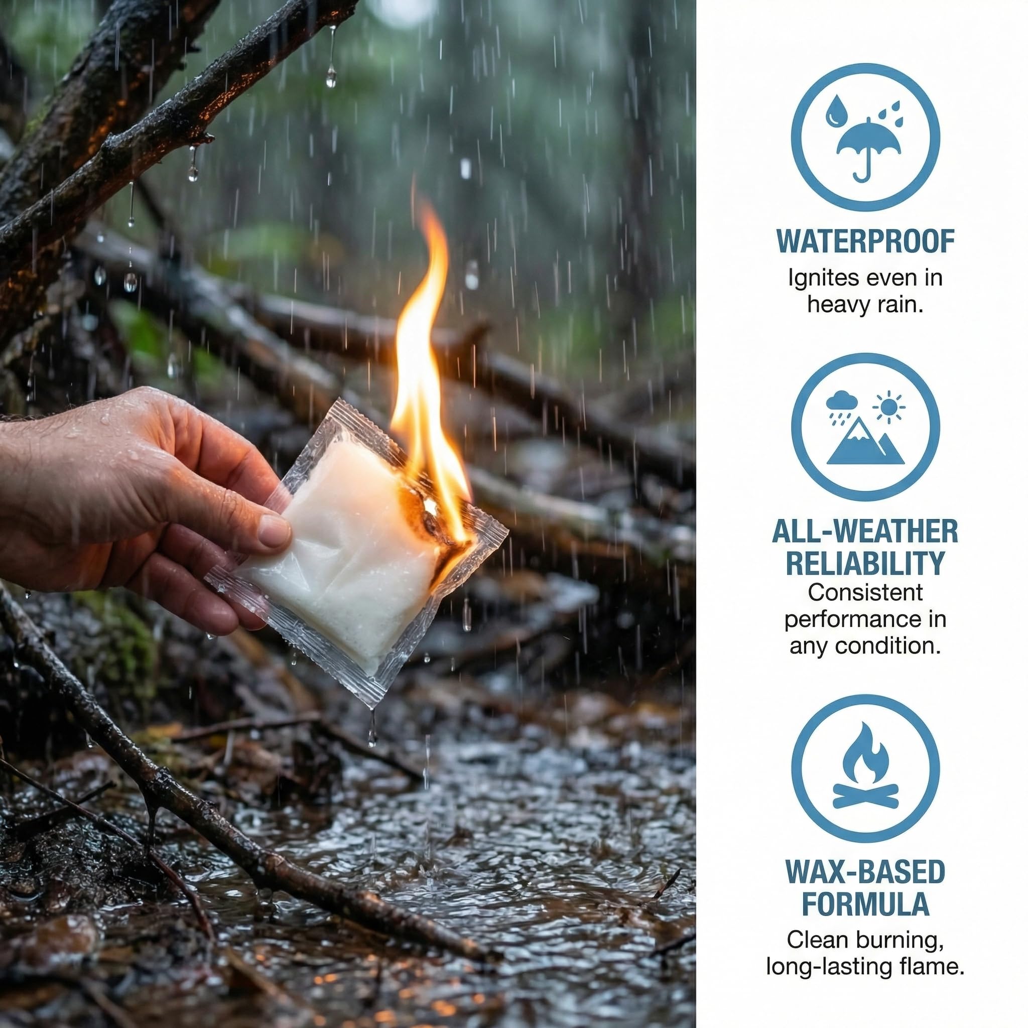 Feature:100% WATERPROOF – Our wax-based formula guarantees complete waterproof performance, enabling it to ignite in all weather conditions, including harsh ones like rain, snow, or strong winds. What's more, it will stay lit even when floating on water.