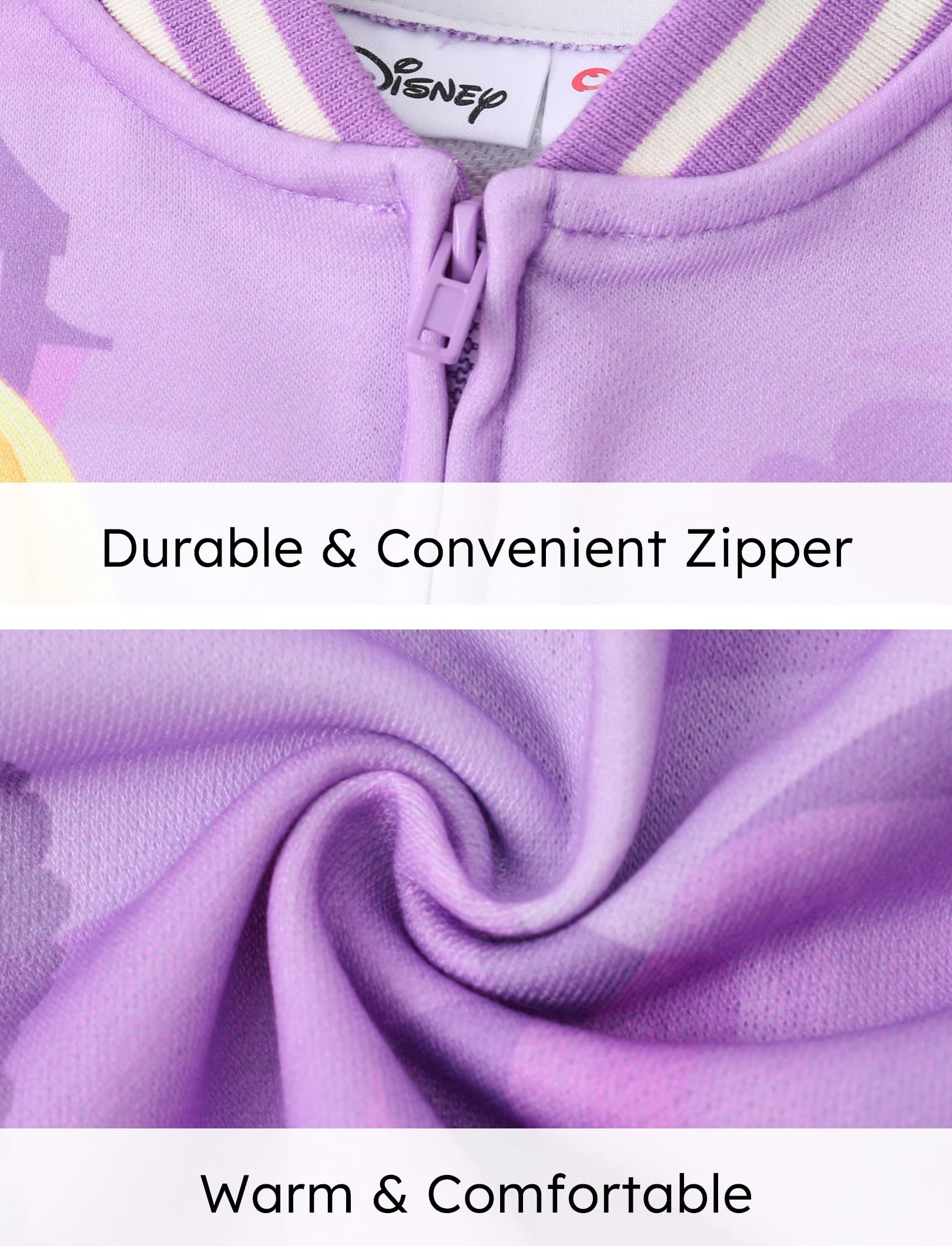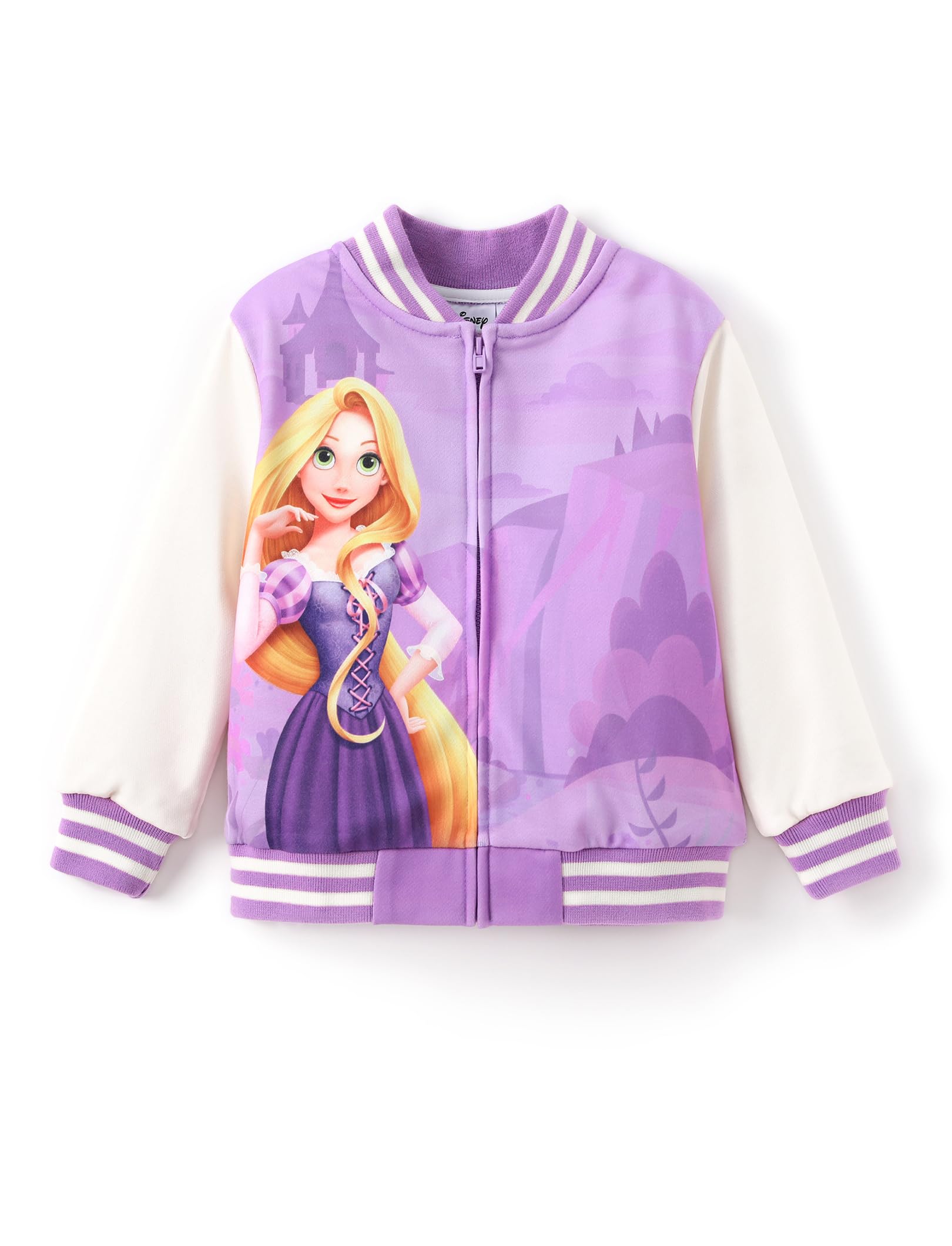 Charming & Fun Design: Let your little one embrace the charm of Rapunzel from Disney's Tangled with this stunning jacket! Featuring Rapunzel in her iconic purple dress, this jacket showcases a beautiful purple color scheme with white sleeves. The striped ribbed cuffs and collar add a sporty touch, making it both stylish and comfortable