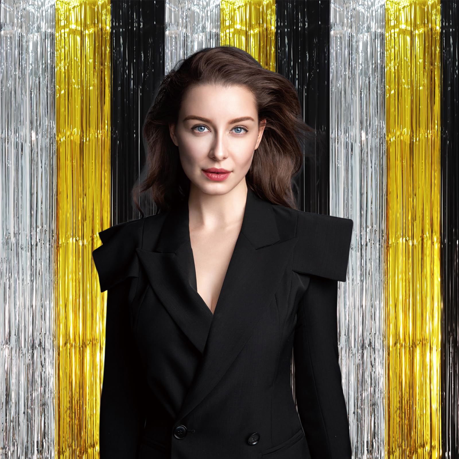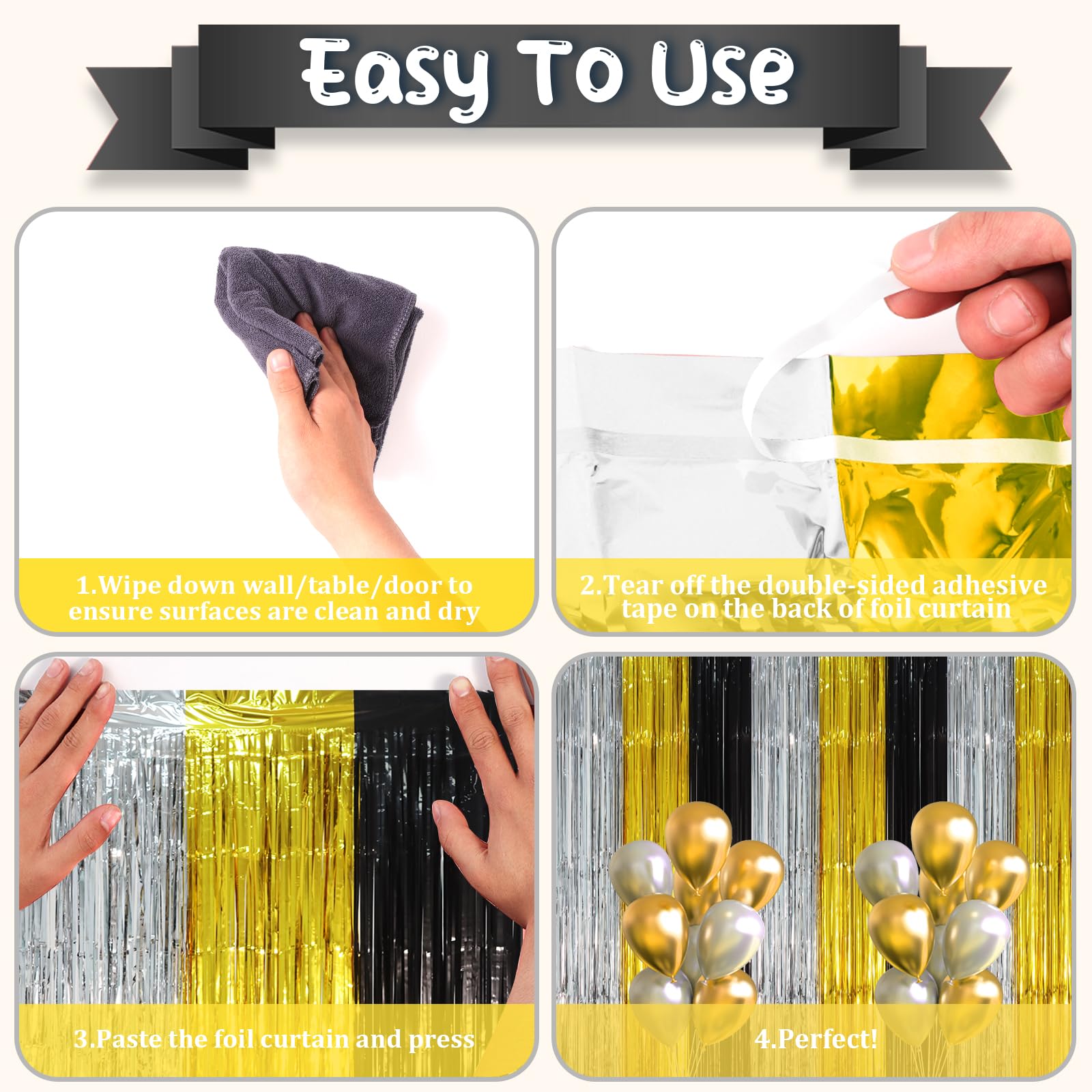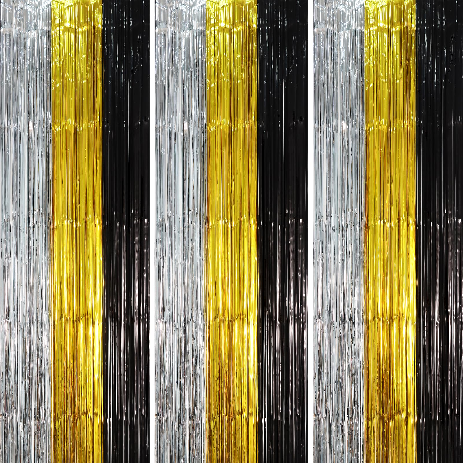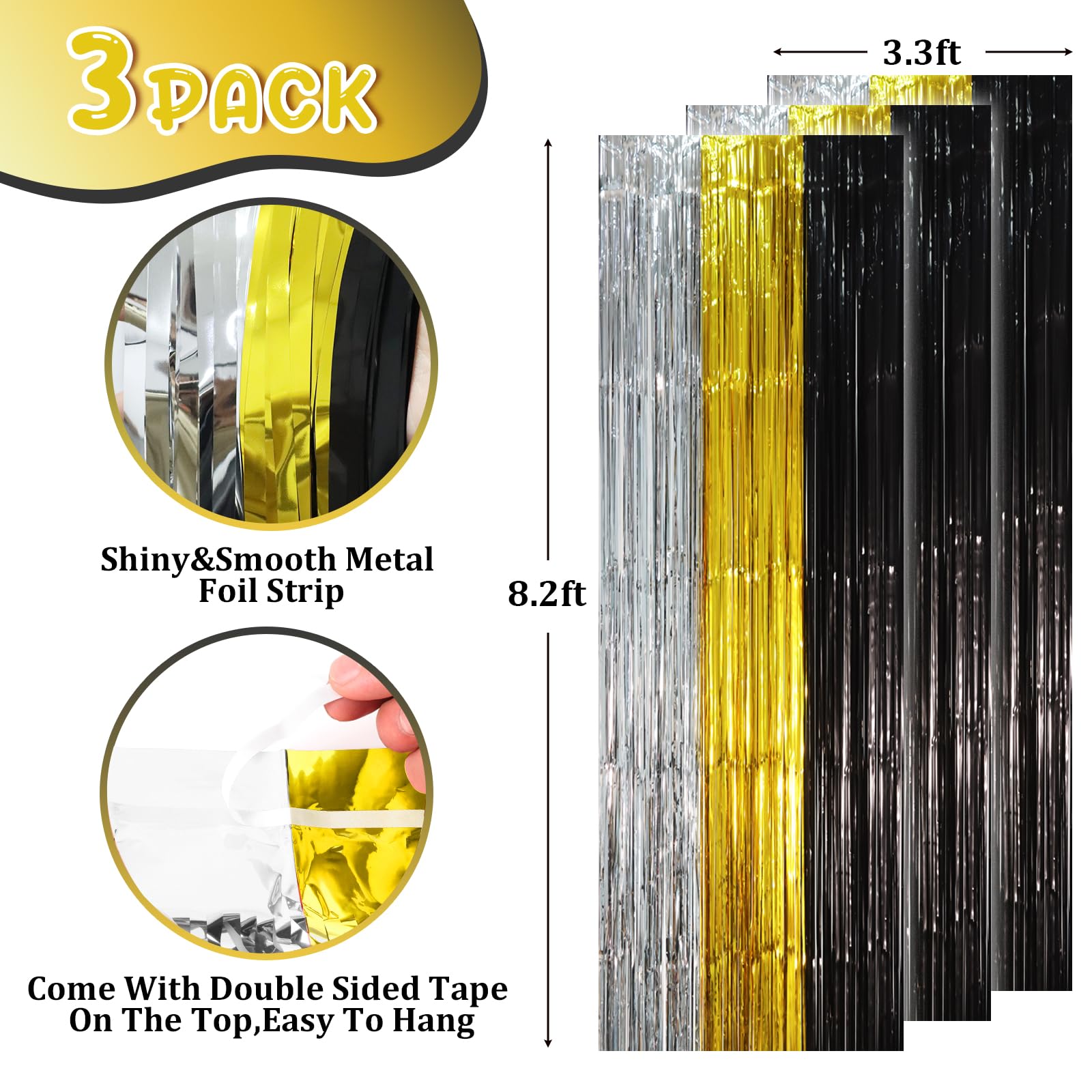 Package Included: 3 packs of black gold and silver foil fringe curtains, the size of the foil curtain is 3.3*8.2ft. It's long enough to fit any occasion