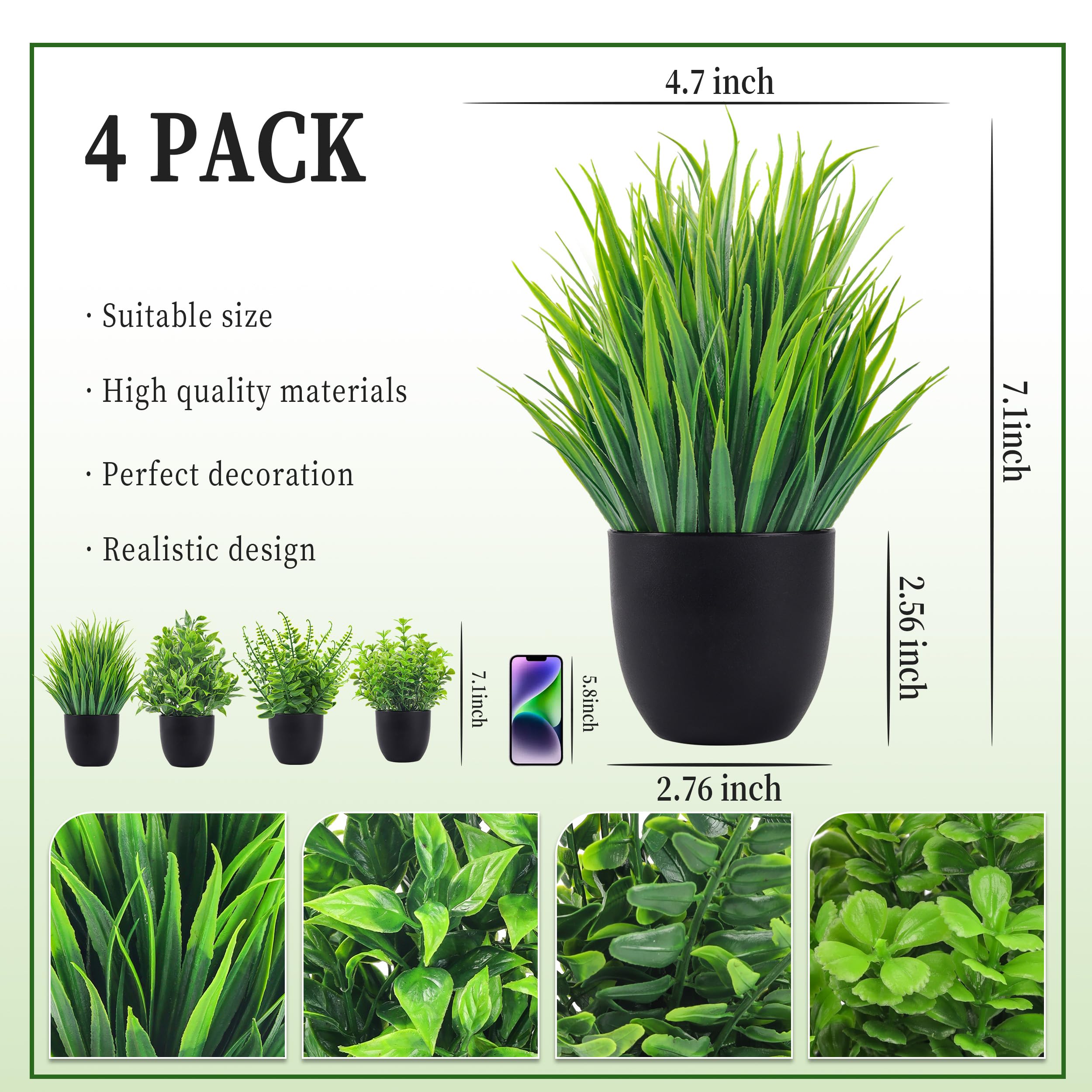 Package Contents: Package contains four faux plants. Each desk plant is 7.18'' high and 4.7'' wide
