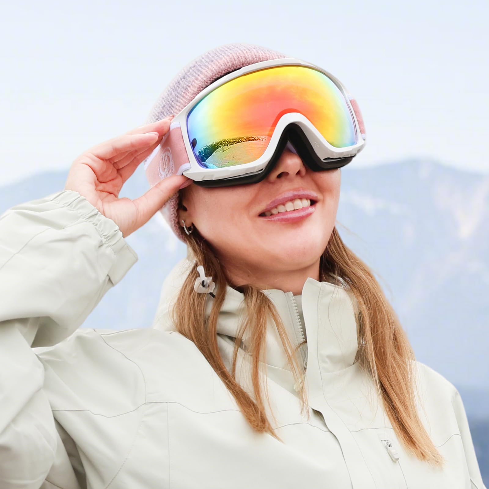 【Performance Double Lens】-Anti-scratch,anti-fog,impact resistance,full face real revo mirror coating reflective lens,100% UV protection,more solid & durable than others ski goggles.The inner lens made by Italy with PRO long-lasting anti fog performance materials,working with ventilation system.NO fogging up when skiing or snowboarding.Great optical clarity spherical lens and frameless design create a super wide HD vision.