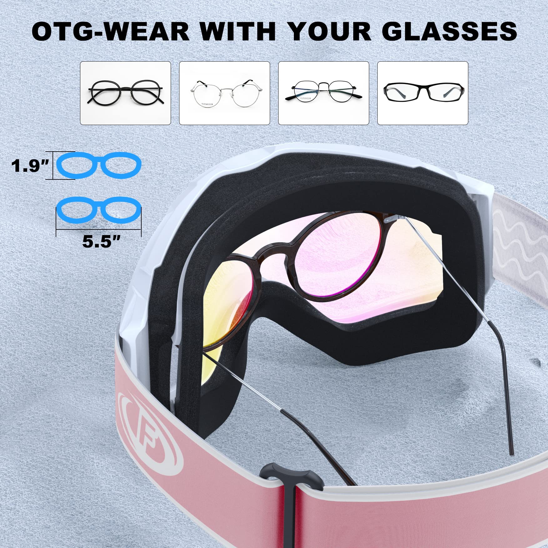 【Oversized OTG (above the glasses) design】-With the OTG (above the glasses) design, the Skiing glasses allow you to wear the glasses under the goggles, and the goggles are also suitable for those who wear glasses. It is perfect for skiing, skiing, snowboarding, ice skating, rock climbing, motorcycling/mountain riding, aerial driving, bungee jumping and more.