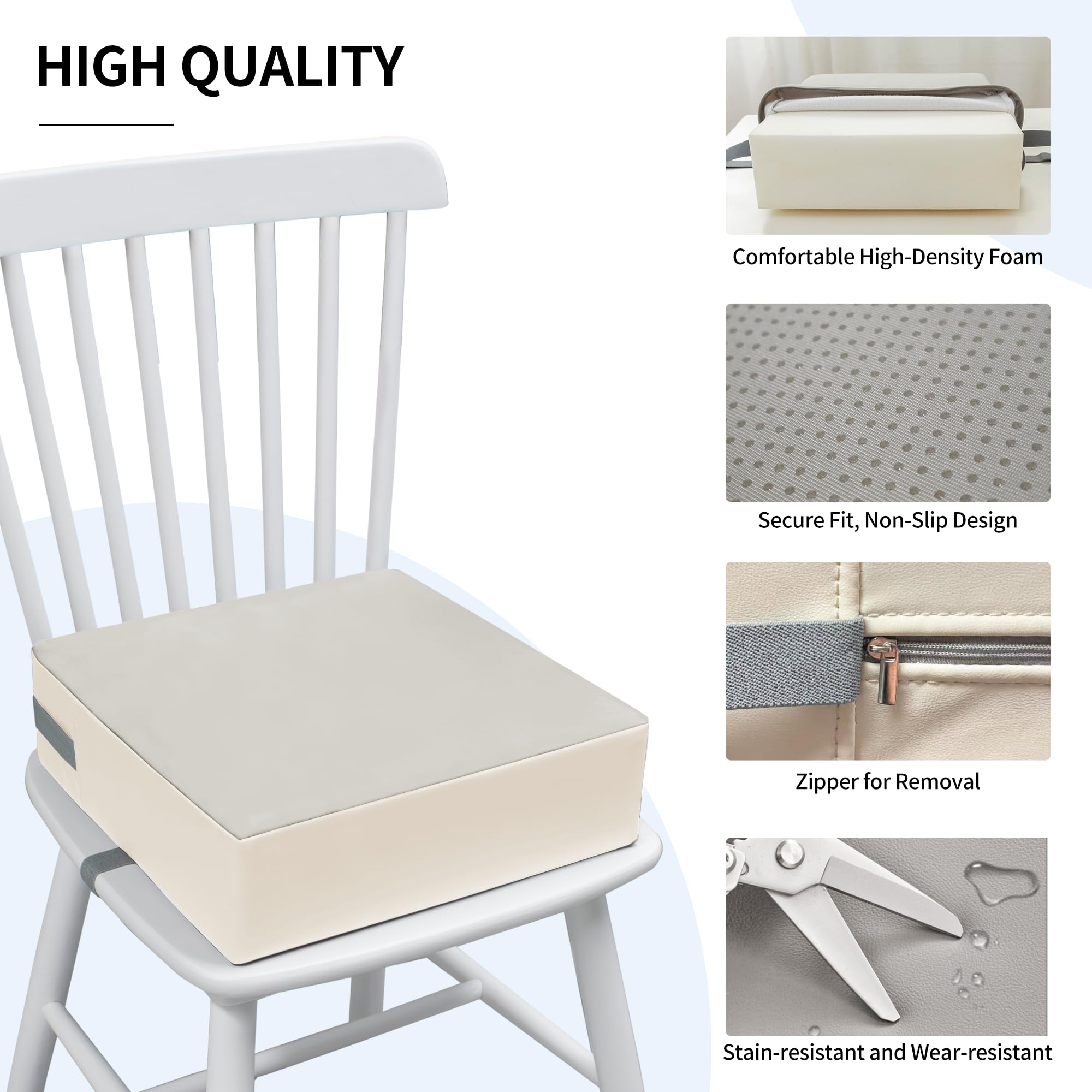Waterproof and Durable: The surface of the table baby booster seat is made of high-quality waterproof PU leather, which is skin-friendly, waterproof, wear-resistant and wrinkle-resistant. If food accidentally falls on the booster pad, you can just wipe it with a damp paper towel to clean it. In addition, the booster pad has a zipper for easy removal and cleaning
