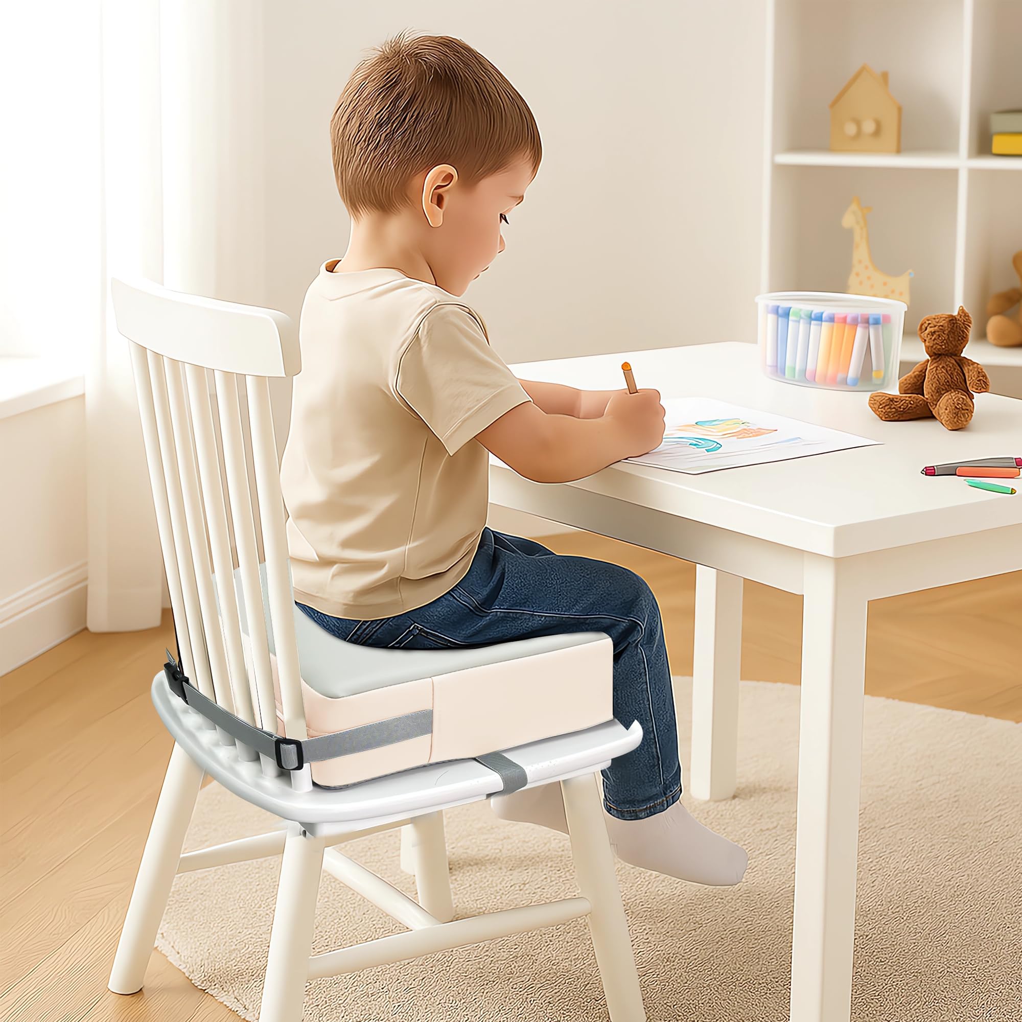 Safe and Anti-slip: Toddler booster seat for the dining table has two elastic safety belts on the seat cushion, which can be fixed on the backrest and bottom of chairs of various sizes, and the bottom of the seat cushion has non-slip silicone to ensure that the seat cushion will not slip. Double protection for children's safety while eating