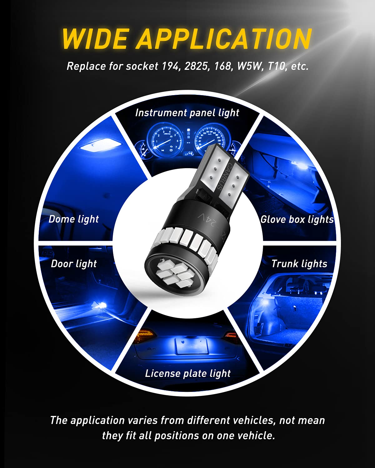 Wide application: The led bulbs can be used for license plate light, map lights, dome light, exterior light, parking city lights, front/rear side marker lights, trunk cargo room lights, turn signal lights, reading lights, glove box lights, inner tail light bulb, etc