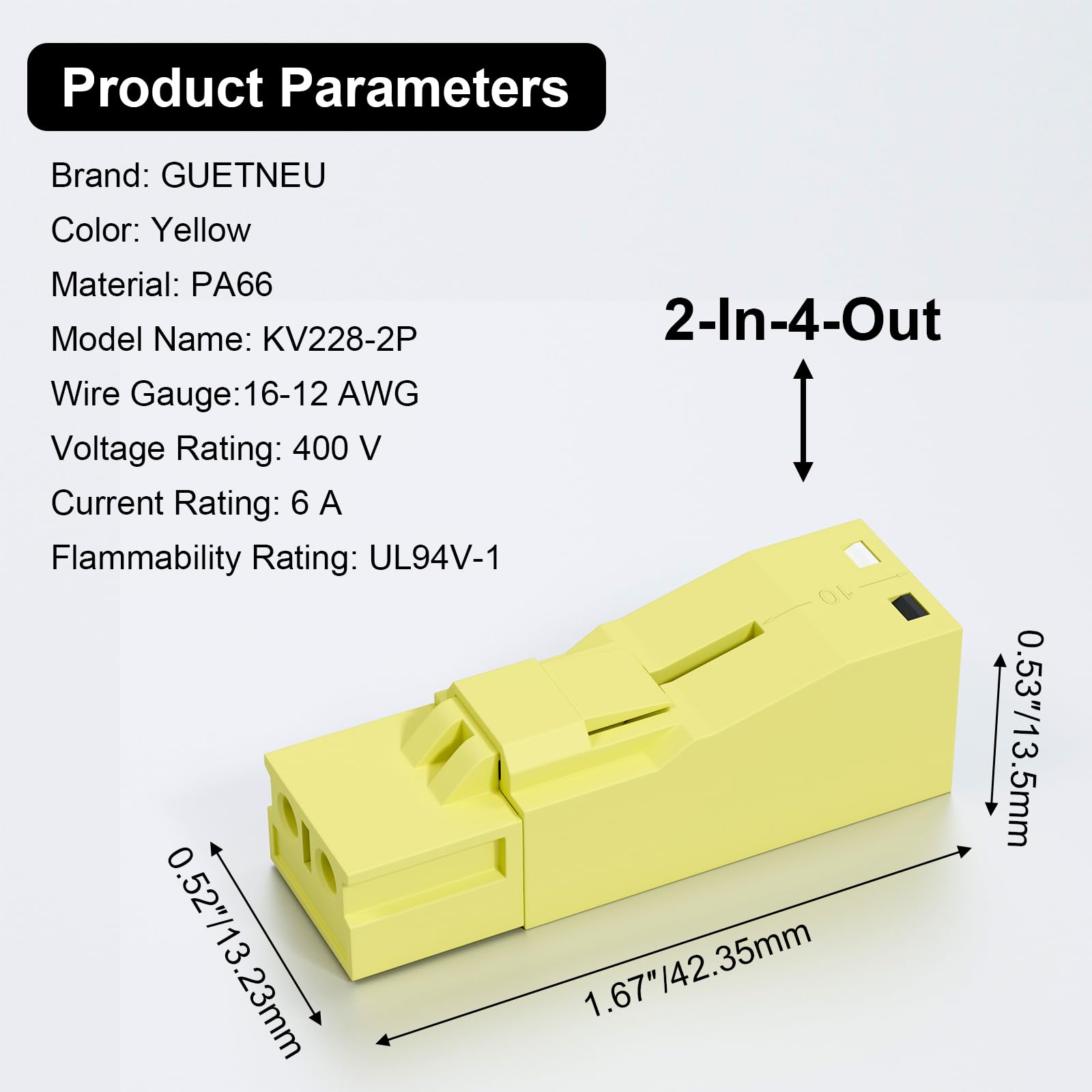 Neat & Organized Wiring: The KV228-2P terminal’s dual independent "1-in-2-out" design optimizes cable management, reducing wire tangling, crossing, or clutter; This ensures clean, orderly layouts, simplifies circuits, and enhances safety