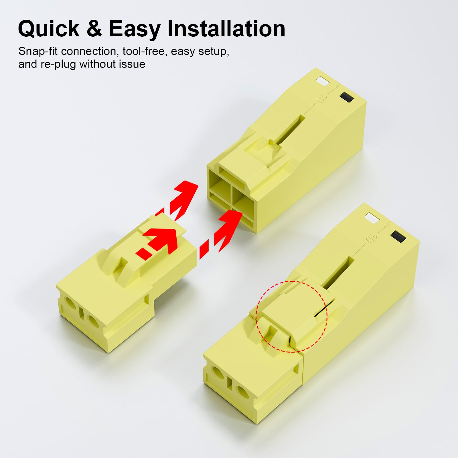 Quick & Easy Installation: Features snap-fit connection for simple, tool-free wiring—just plug in securely within seconds; To remove, press the latch and pull; Effortless setup and disassembly boost efficiency; Even if misconnected, re-plugging is hassle-free with no lasting impact