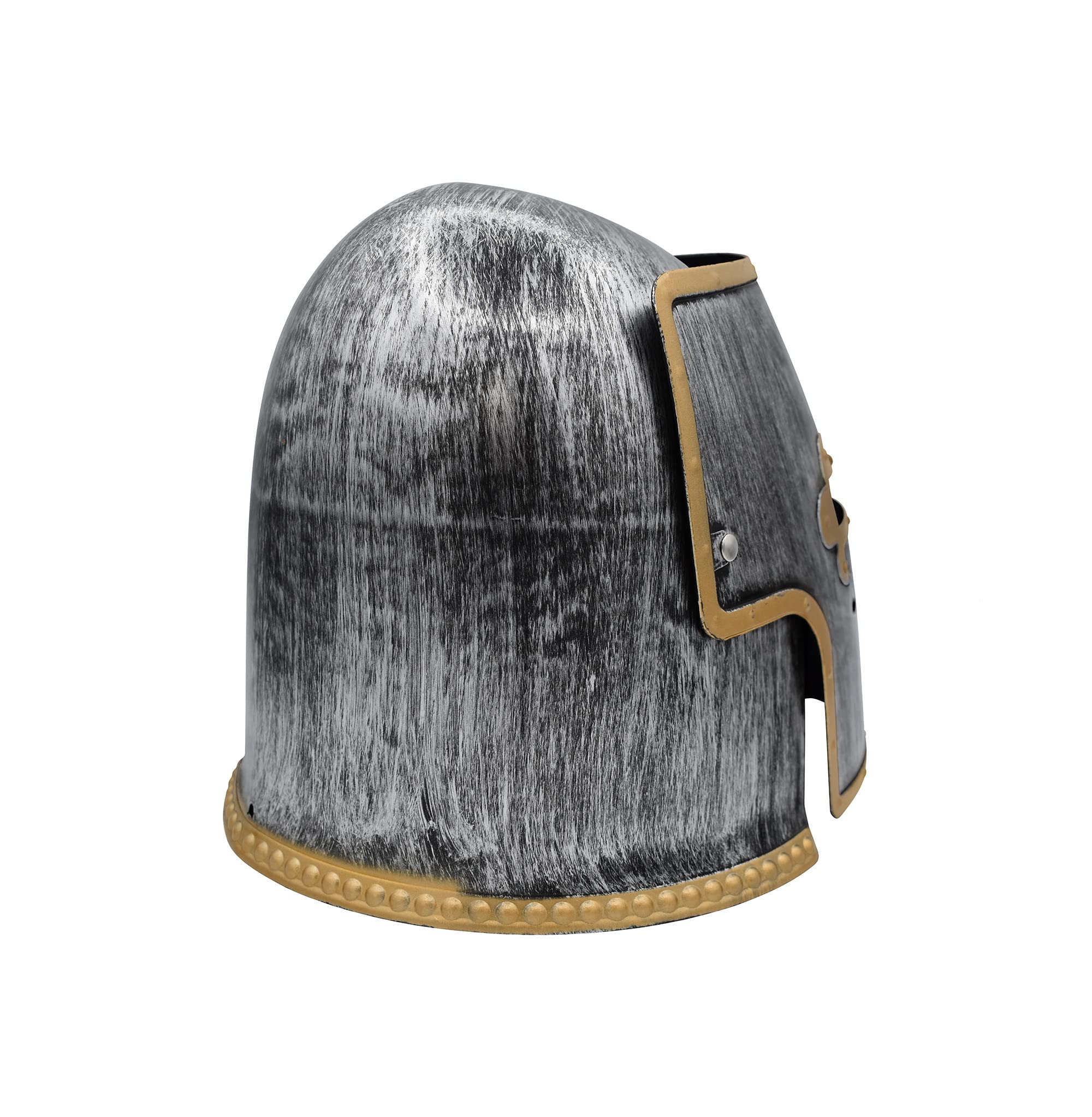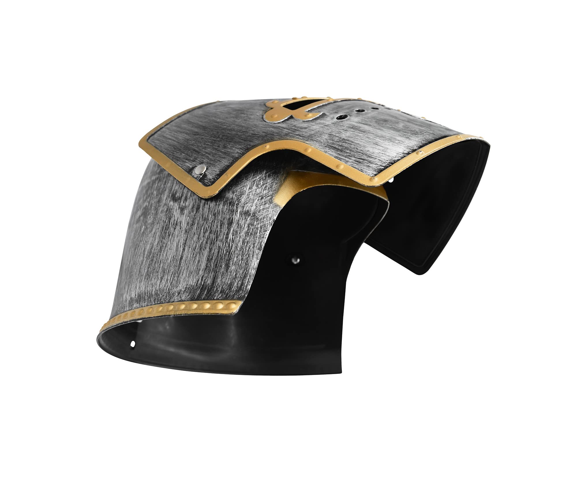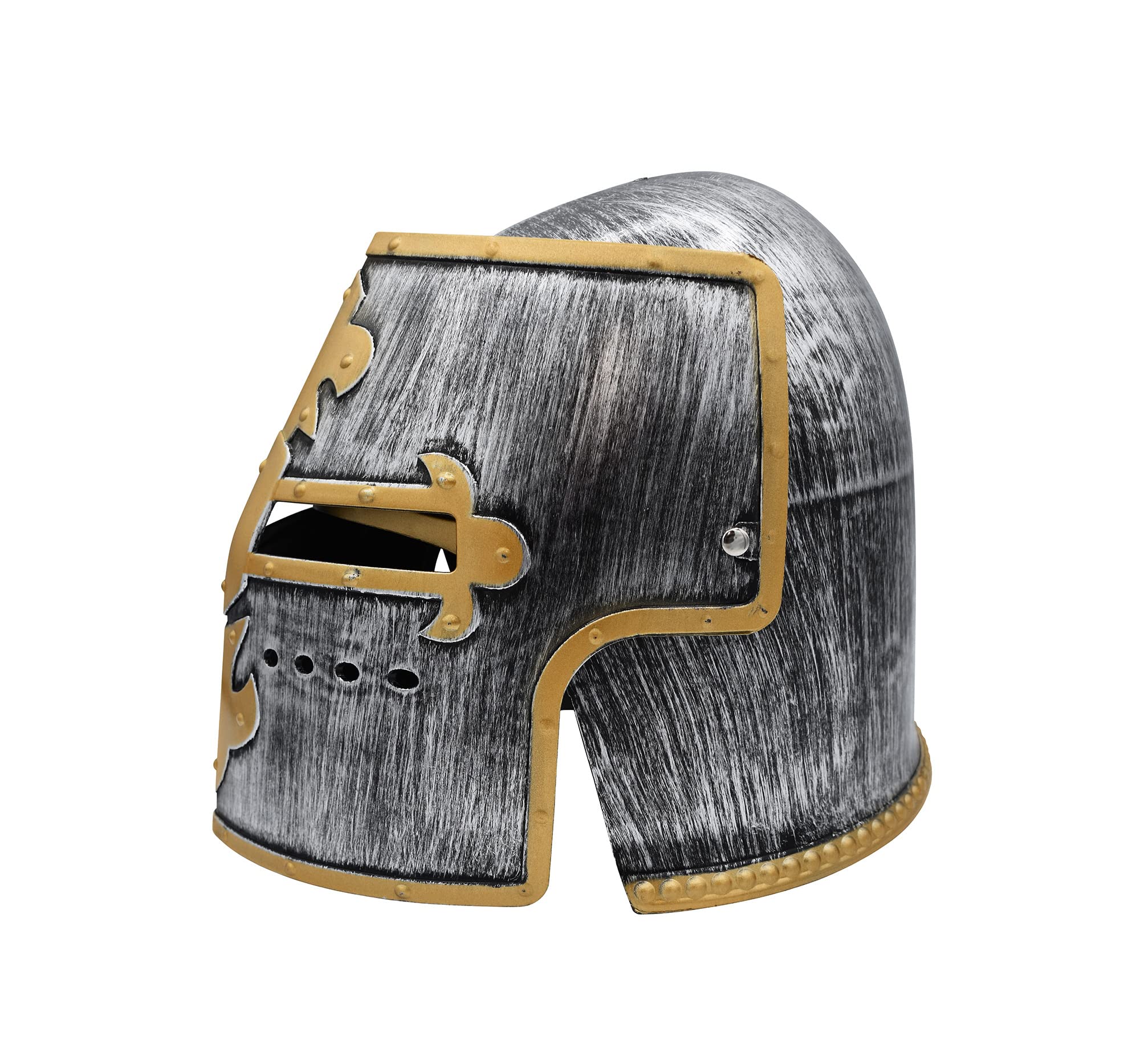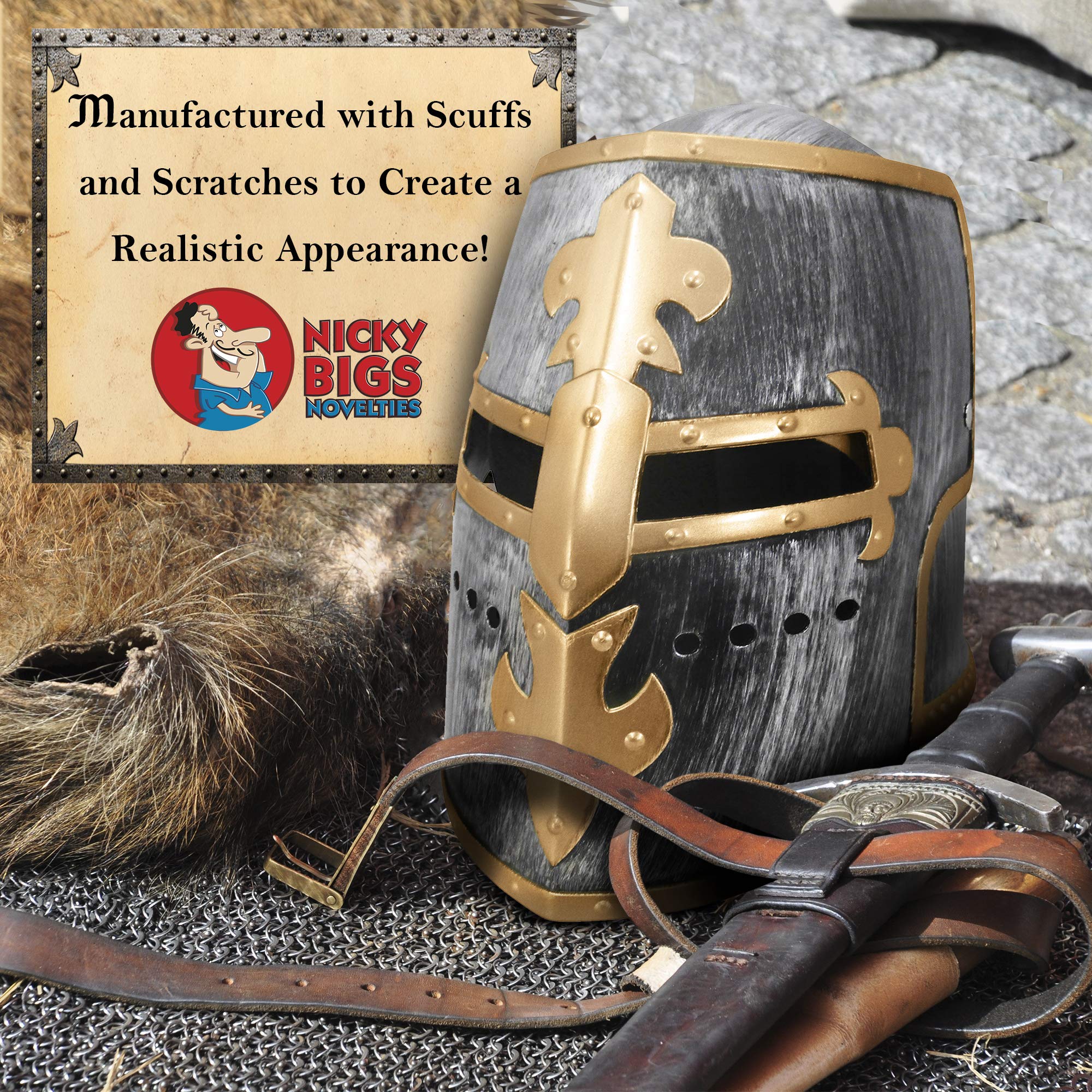 MEDIEVAL INSPIRED DESIGN: Availalble in three colors to choose from, Gold, Silver and Matte Black. The Nicky Bigs Novelties knight helmet features a striking metal crusader helm appearance, crafted from durable plastic, making it a standout addition to medieval or Renaissance costumes.
