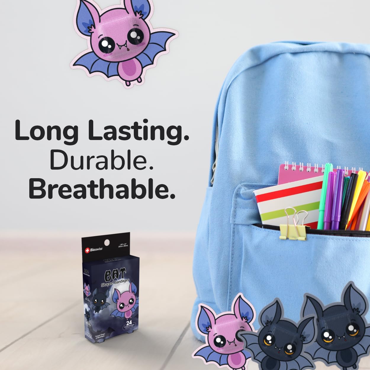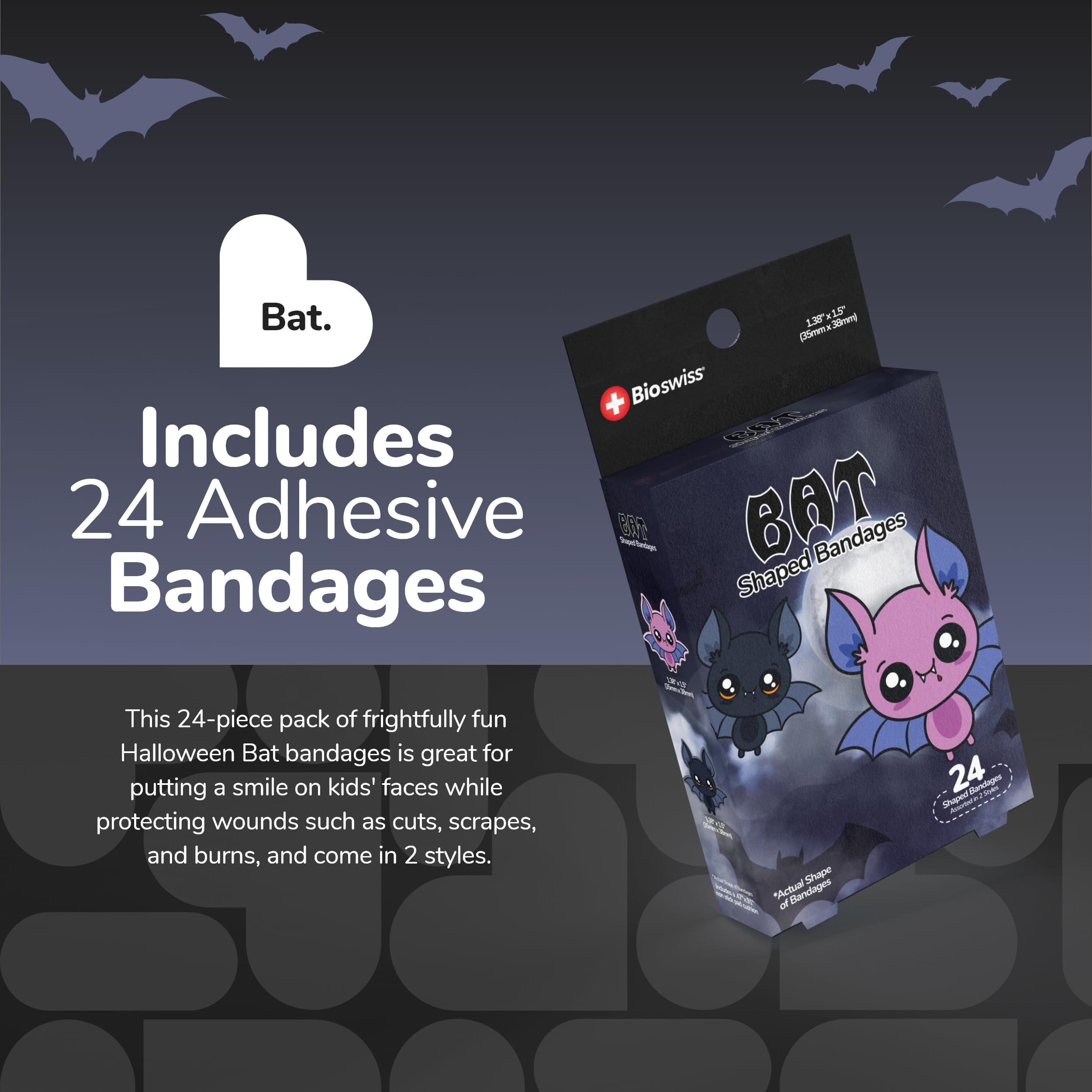 24 HALLOWEEN BATS KIDS BANDAGES: Fun bat-shaped adhesive bandages pack helps protect cuts, scrapes, and minor wounds while making healing less stressful for children; bandages come in 2 assorted styles