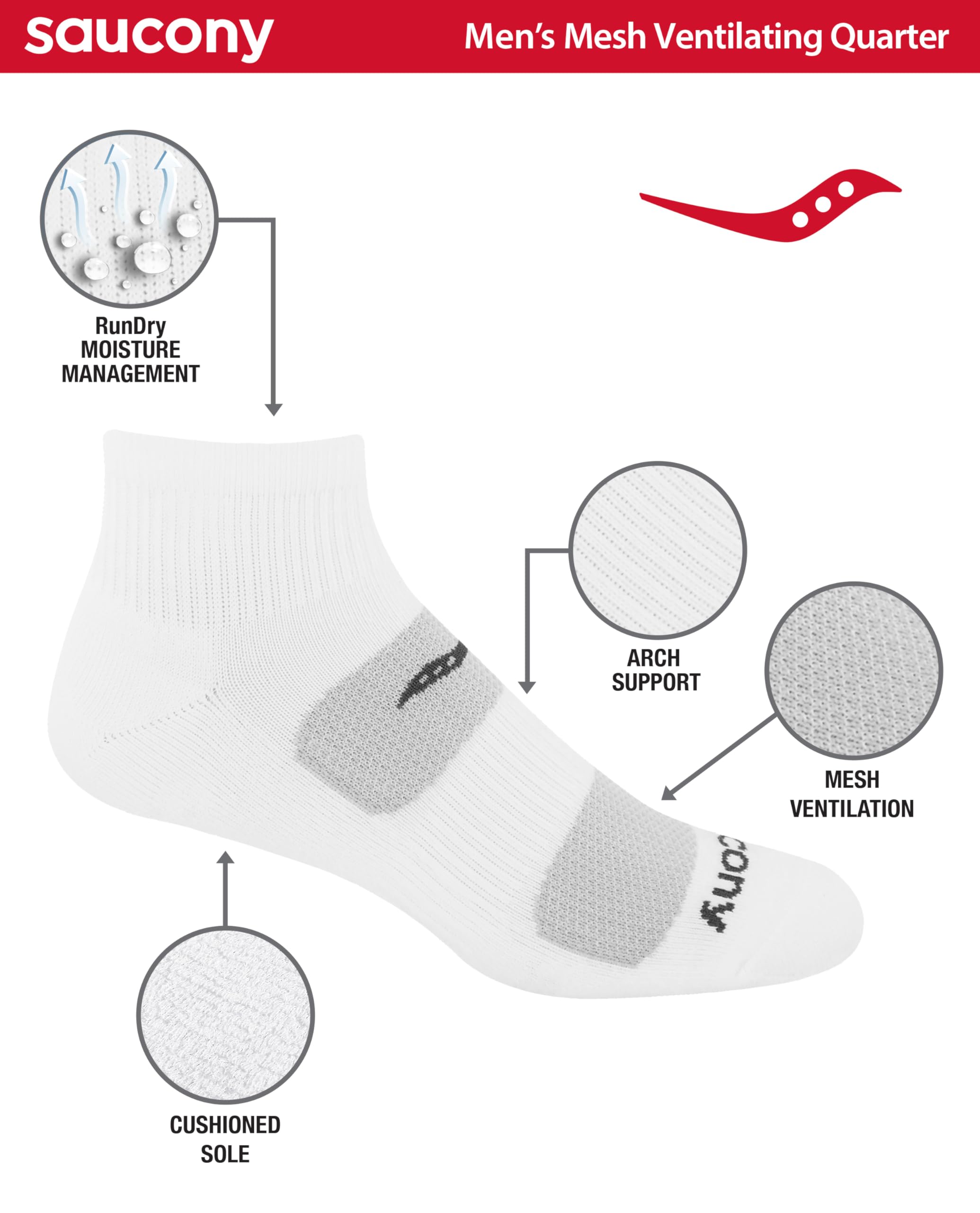 Description Saucony Men's Multi-Pack Mesh Ventilating Comfort Fit Performance Quarter Socks are a perfect combination of comfort and support. Great for the toughest training sessions. Its arch support, air mesh venting, and moisture management features will ensure lasting comfort. Run for Good - Saucony was founded way back in 1898. Ever since, we have been loyal to the sport, building goodness into every product and inviting millions around the world to run with us. At Saucony, we exist for runners, Runners inspire us, bringing us new idea, force us to be better, they drive our design and engineering. They keep us competitive. They keep us hungry. They keep us honest. This focus and passion fuels us as we strive to create the best running shoes and apparel on the planet. We leave work each day knowing we’ve done everything to make runners live just a little better.