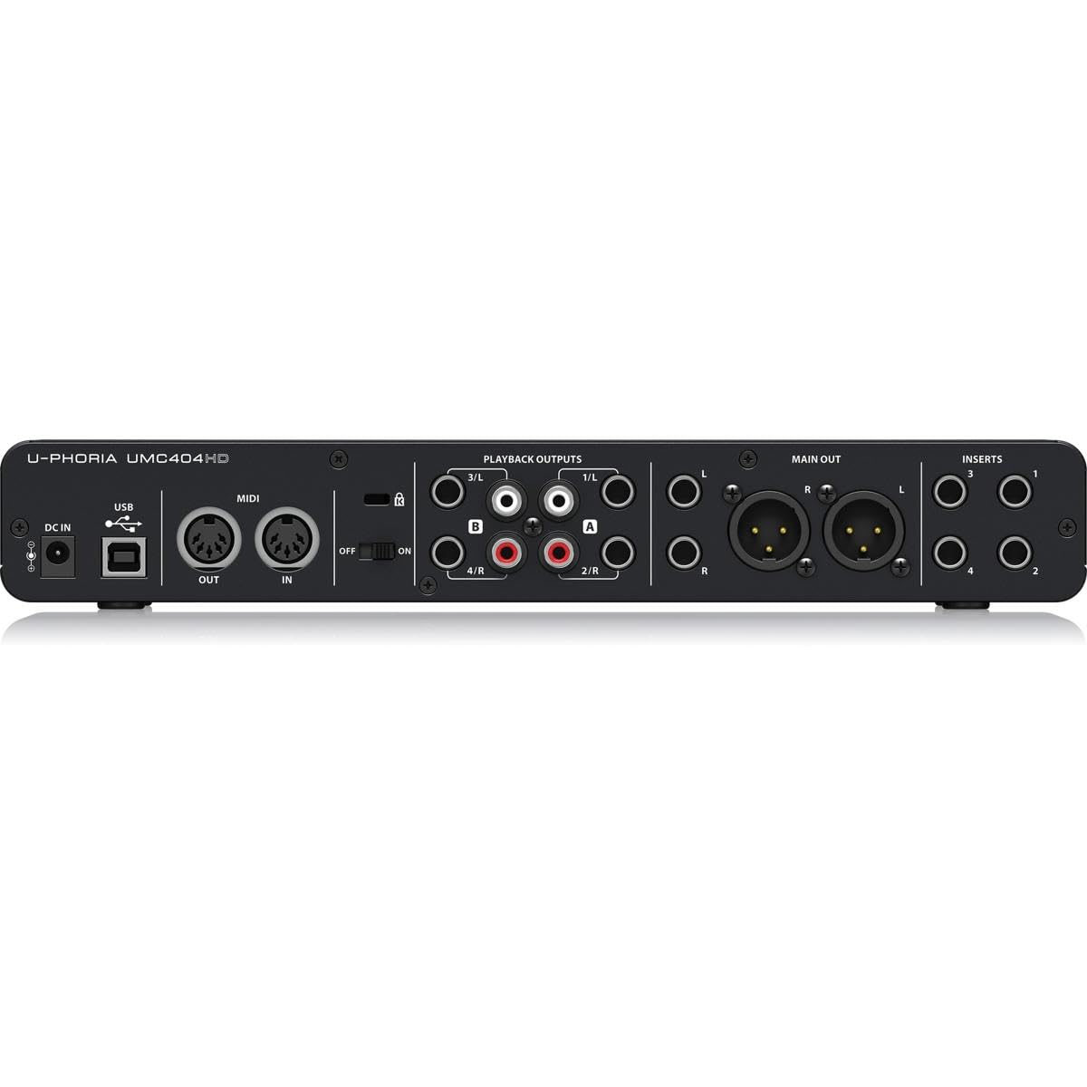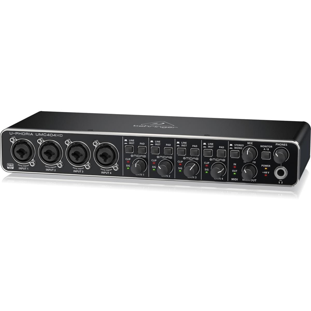 BEHRINGER U-PHORIA UMC404HD. Maximum input level : Mic: -4 dBu / Line: +20 dBu / Instrument: -3 dBu, Frequency response: 10 Hz – 43 kHz (0 / + 0.3 dB) Main Outputs on balanced XLR and 1/4" TRS connectors.