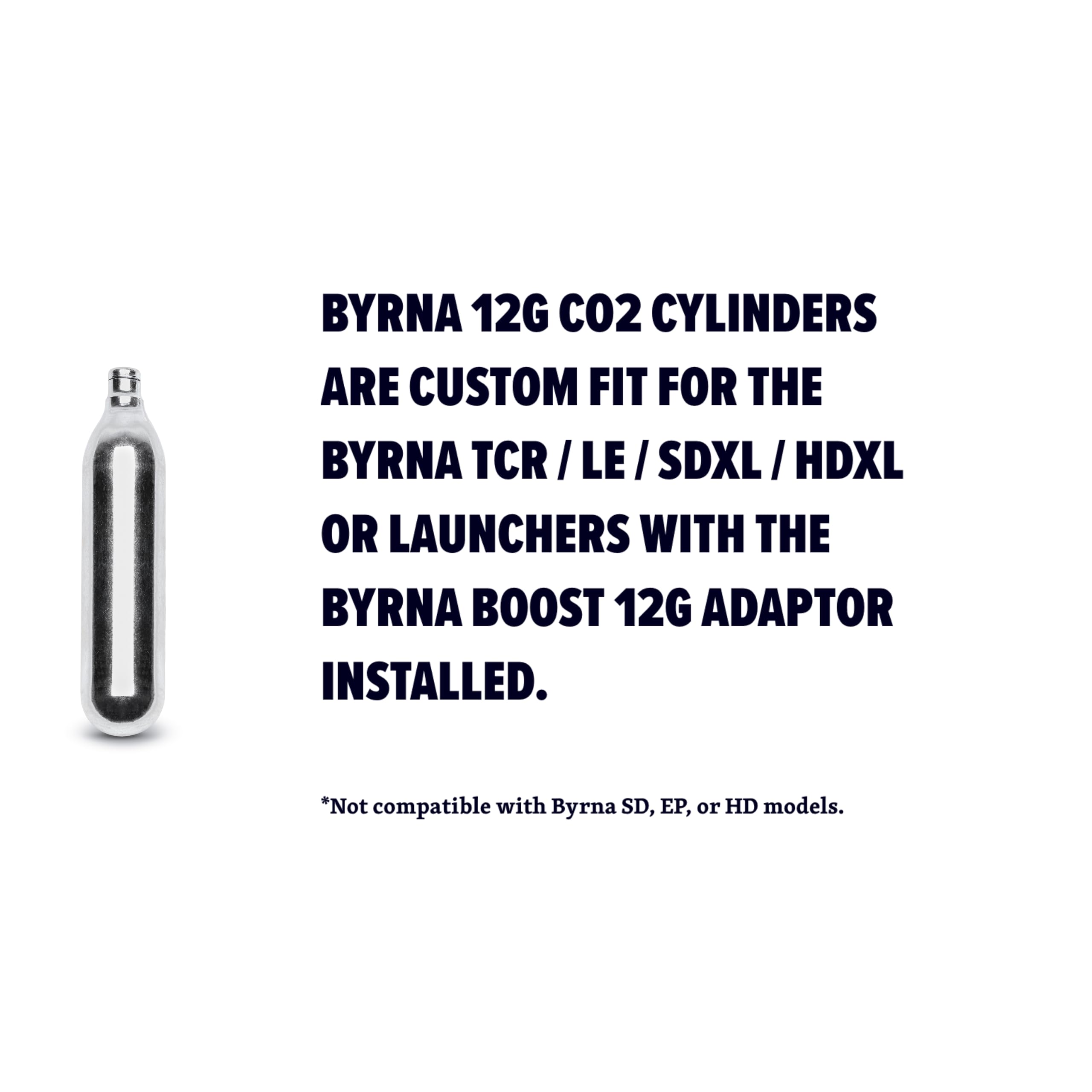 COMPATIBILITY: Byrna 12g CO2 cartridges are custom fit for the Byrna TCR / LE / SDXL / HDXL or launchers with the Byrna boost 12g adaptor installed.