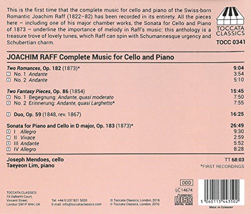 This release includes one of Joachim Raff's major chamber works, the sonata for Cello and Piano of 1973, in its first recording. All the pieces here underline the importance of melody in Raff's music. This anthology is a treasure trove of lovely tunes, which Raff can spin with Schumannesque urgency and Schubertian charm.
