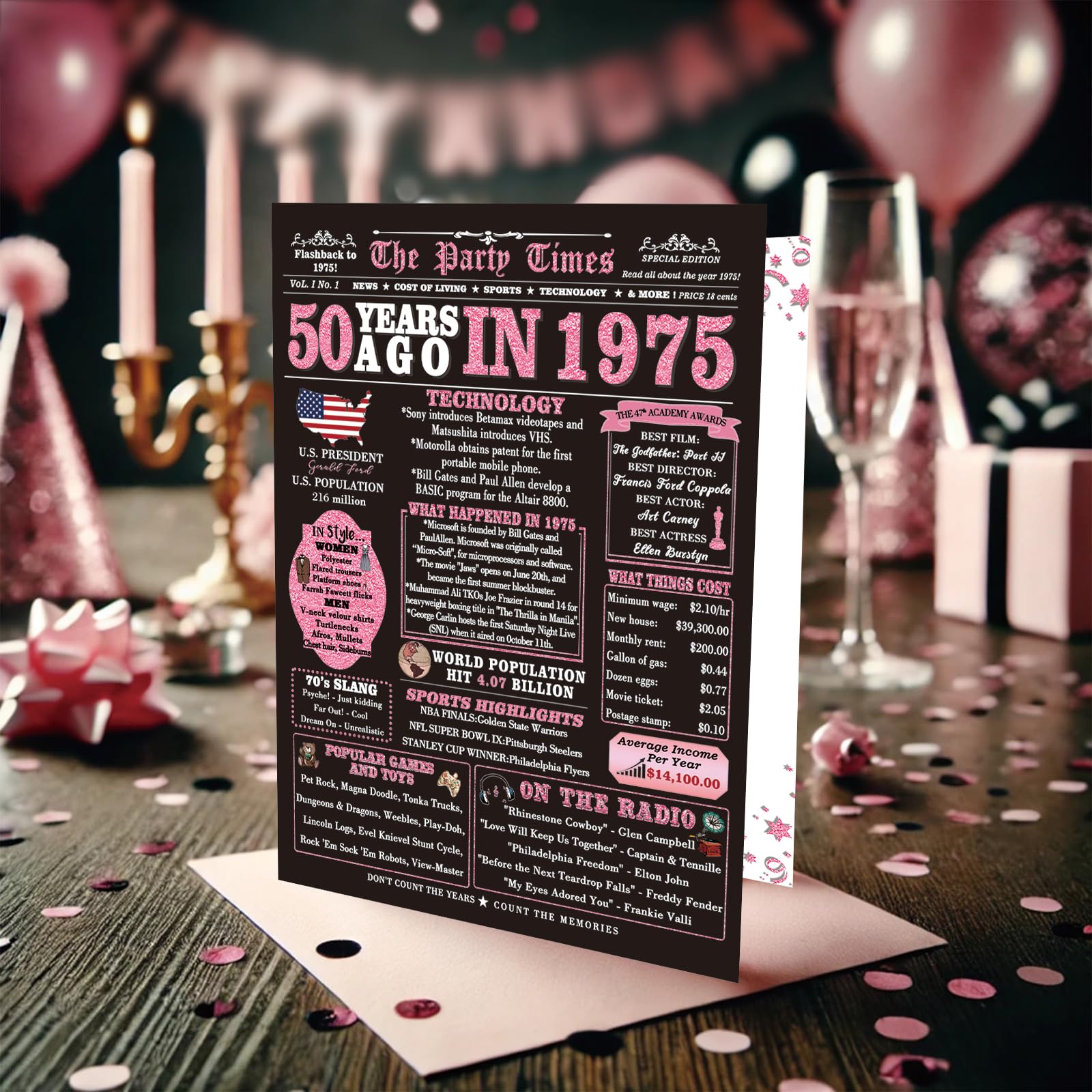 This beautifully designed card features a "Back in 1975" theme with elegant rose pink gold accents, perfect for celebrating her milestone birthday in style.