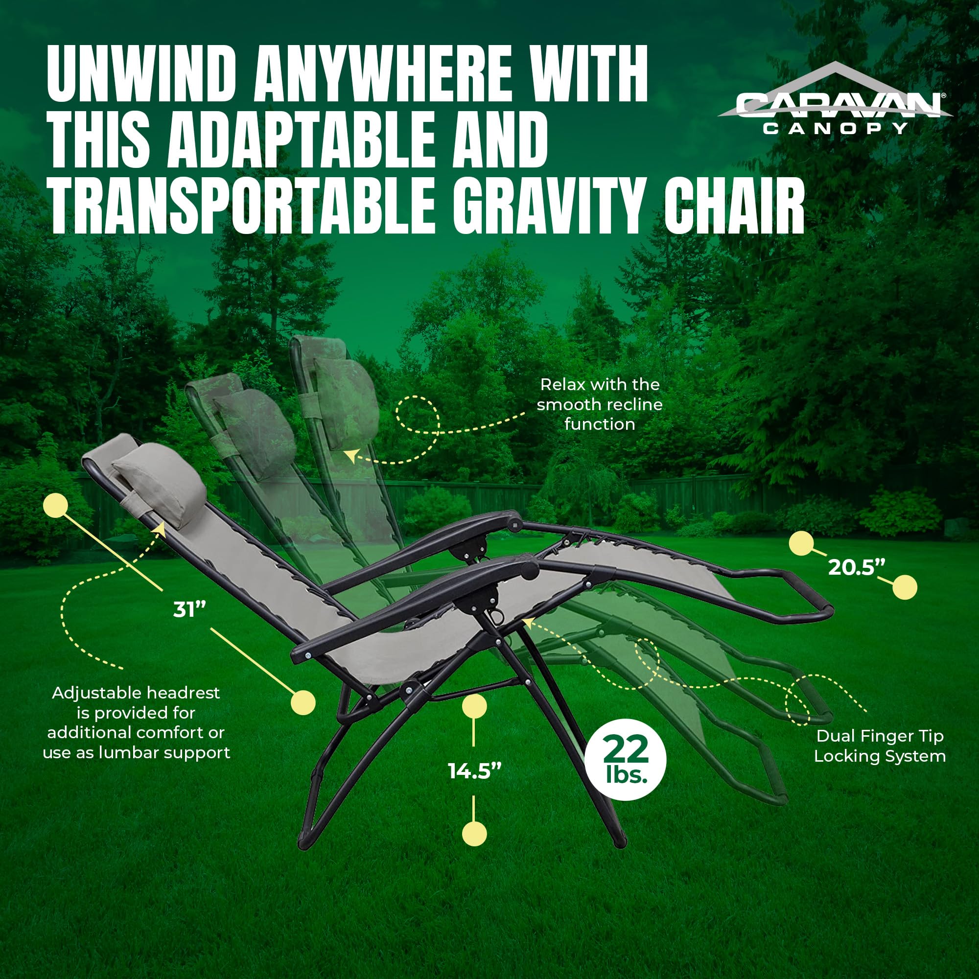 UNWIND ANYWHERE: Adaptable and transportable Caravan Sports Zero Gravity Chair is great for outside seating, hanging by the fire pit, taking a rest while camping, and more