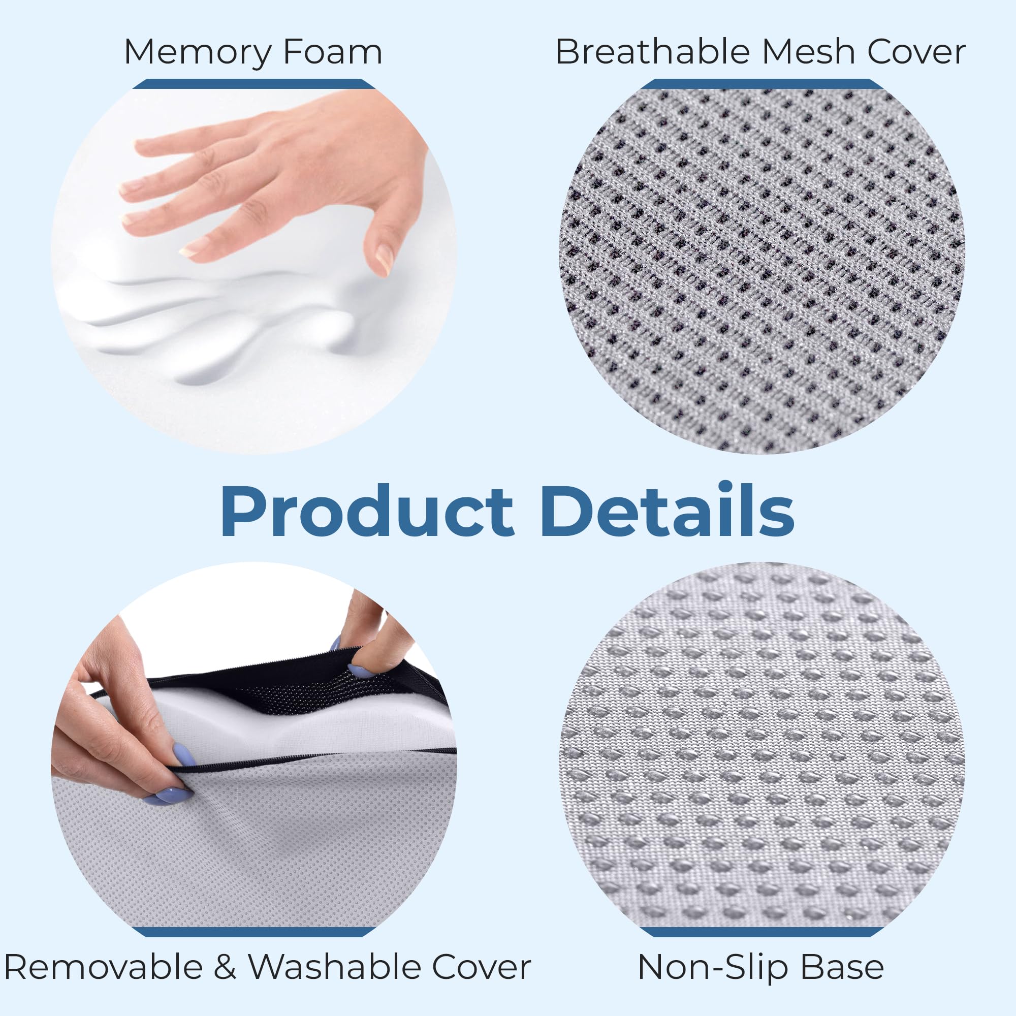𝗛𝗶𝗴𝗵 𝗤𝘂𝗮𝗹𝗶𝘁𝘆 𝗖𝗵𝗮𝗶𝗿 𝗣𝗮𝗱 - Measuring 17.7"x 13.8"x 2.8", the butt support pillow comes with a removable and breathable black mesh cover, that provides great air circulation and allows you to sit without feeling hot or sweaty. The non-slip rubber base of the pad securely keeps it in place. The cushion insert is made from Slow Rebound Memory Foam that conforms to your individual shape and helps to avoid pressure. The handle is attached to the side of the pillow, making it easy to take it with you