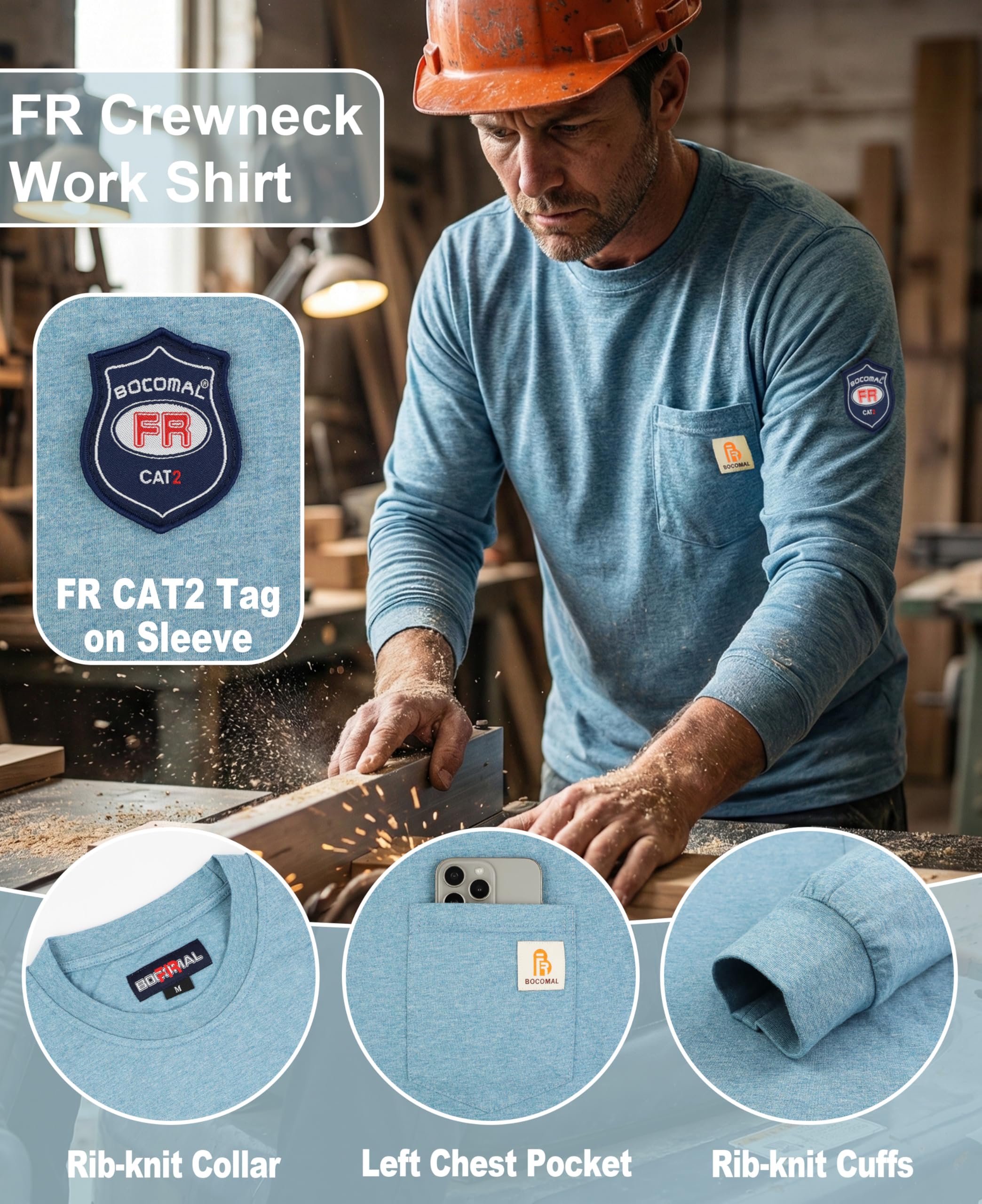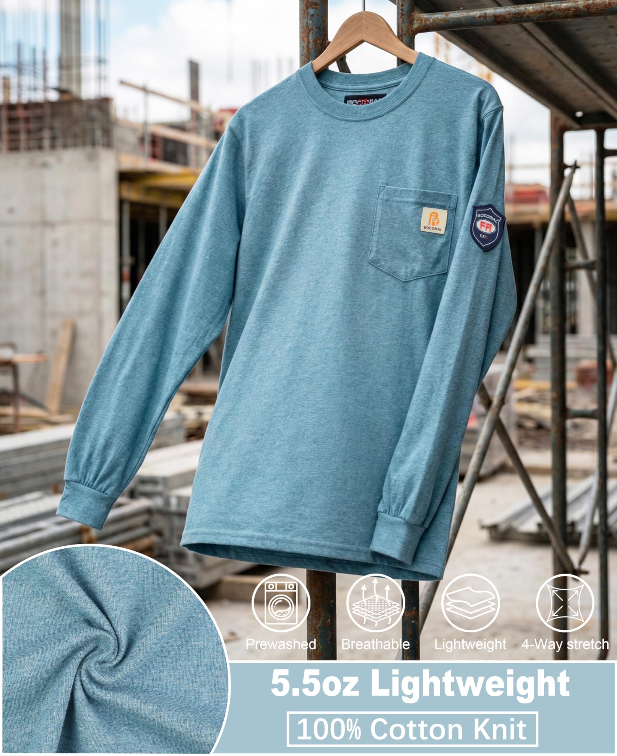 FR MATRIALS LIGHTWEIGHT:5.5oz knit featured flame resistant treated cotton,stitched with FR armid threads.Eyecatch FR Tag on pocket.we have included a small sample inside the package for customers to try out the FR properties firsthand.