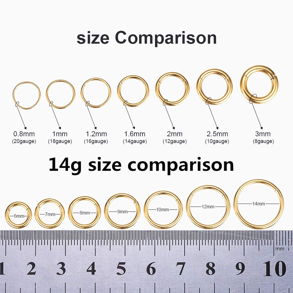 Quantity:2pcs,Nose Hoop Ring/Earring Hoop Size: 14 gauge (thickness: 1.6mm), inner diameter 5/16 inches(8mm ),Please choose your gauge and diameter hoop for your nose piercing needs.It has a smooth closure that doesn't slipped or opened. It's still tight after long-term use.