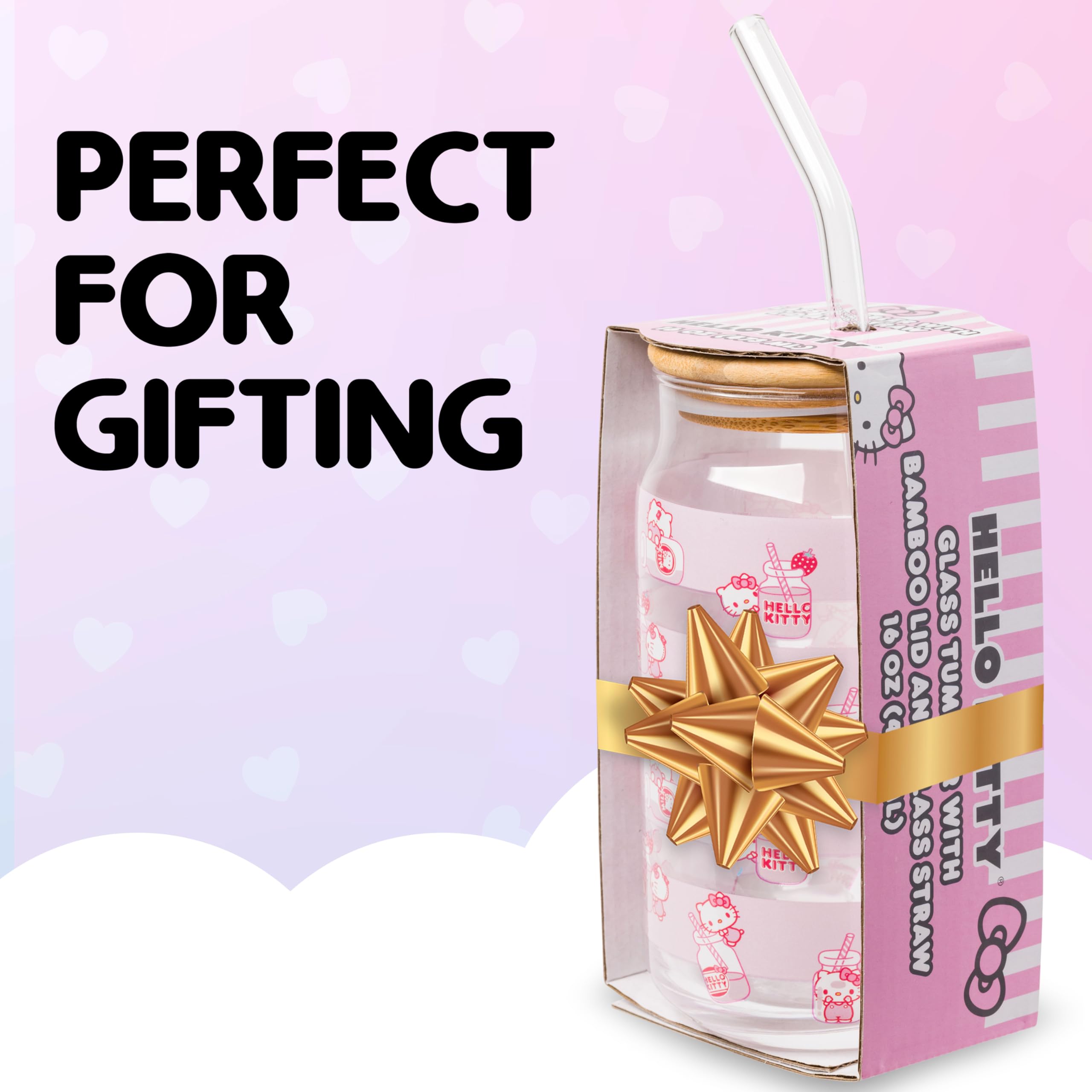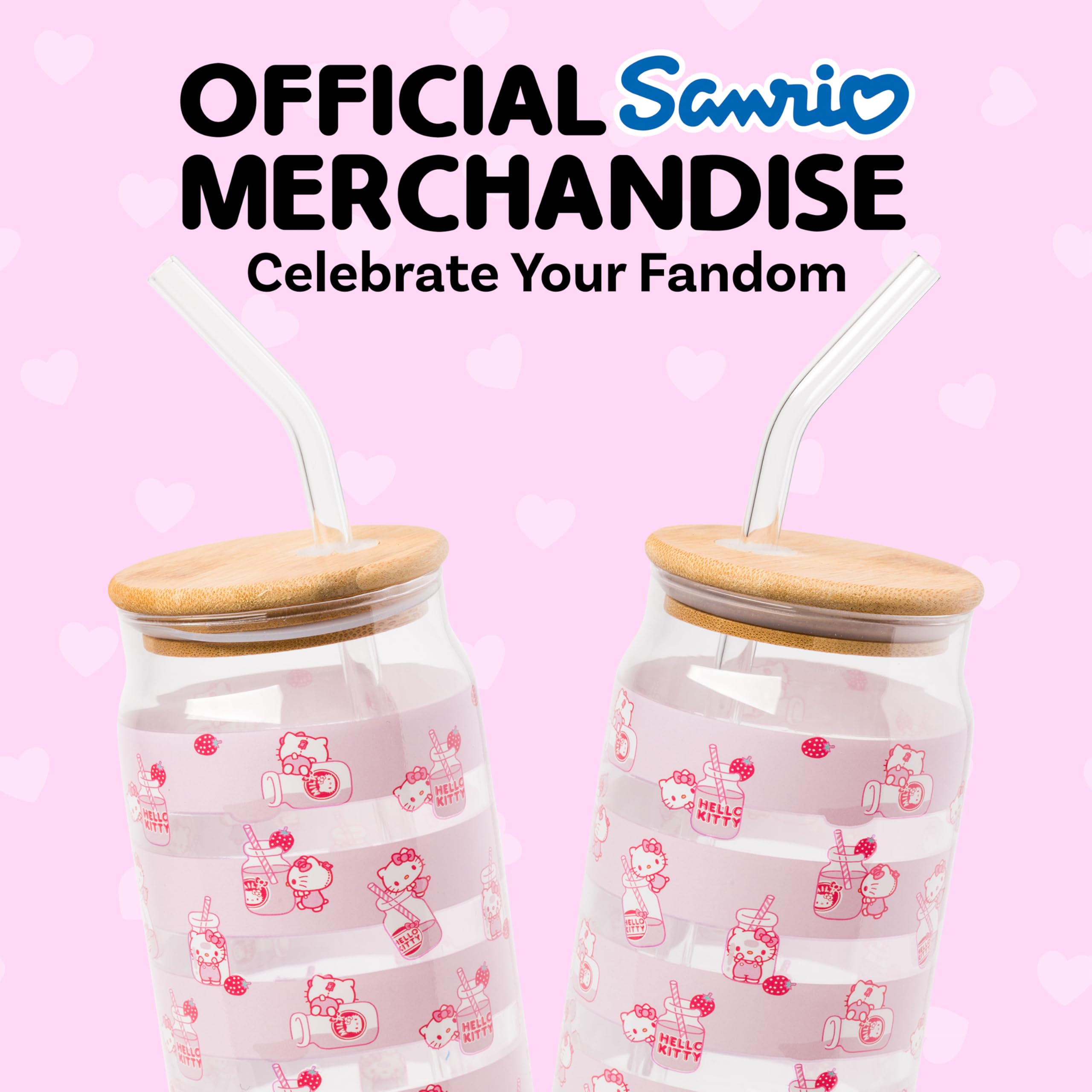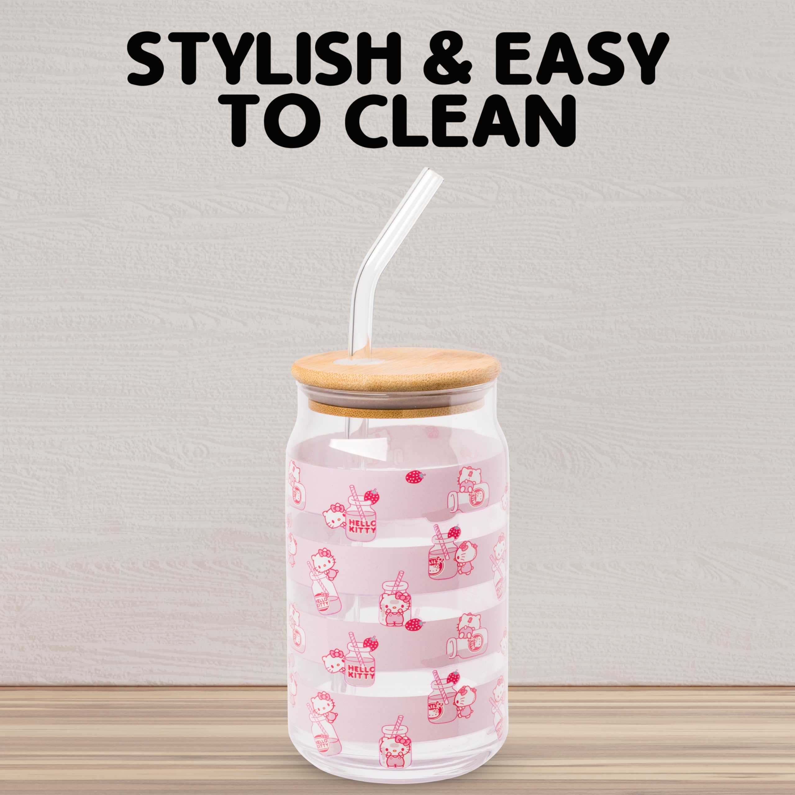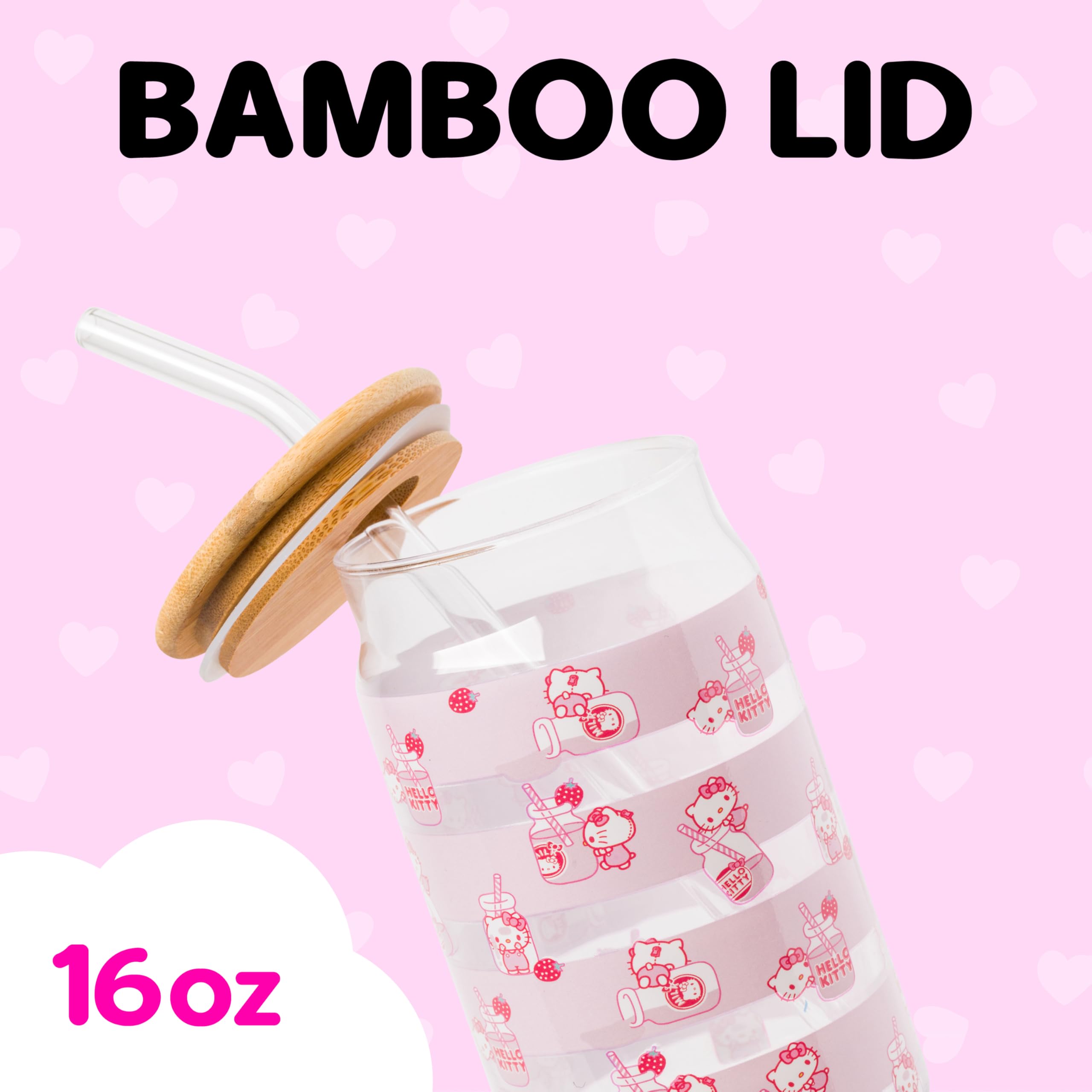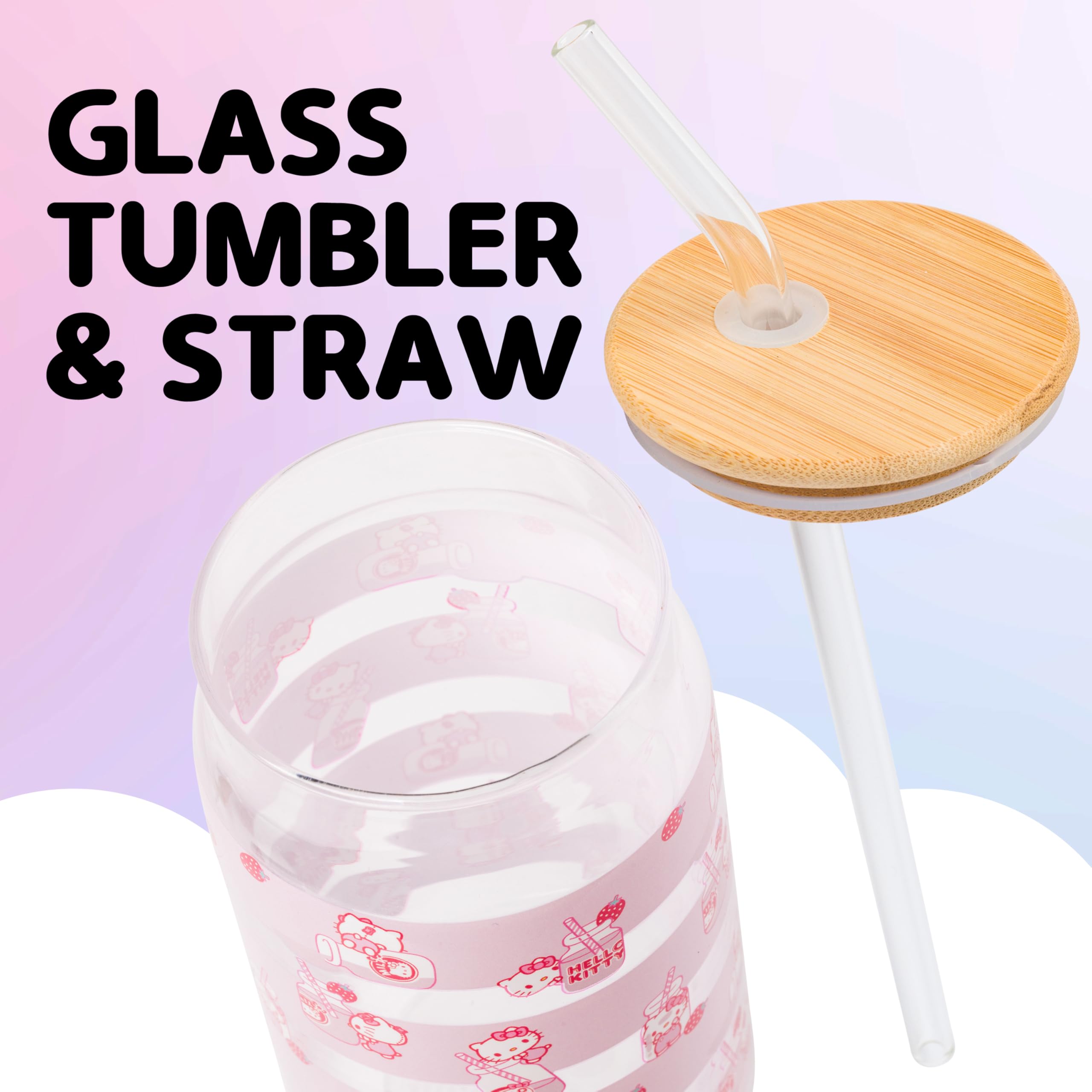 HELLO KITTY TUMBLER: Enjoy your favorite beverages in style with this charming 16 oz glass tumbler featuring an adorable Hello Kitty milk bottle toss design. Comes with a bamboo lid and a reusable glass straw.
