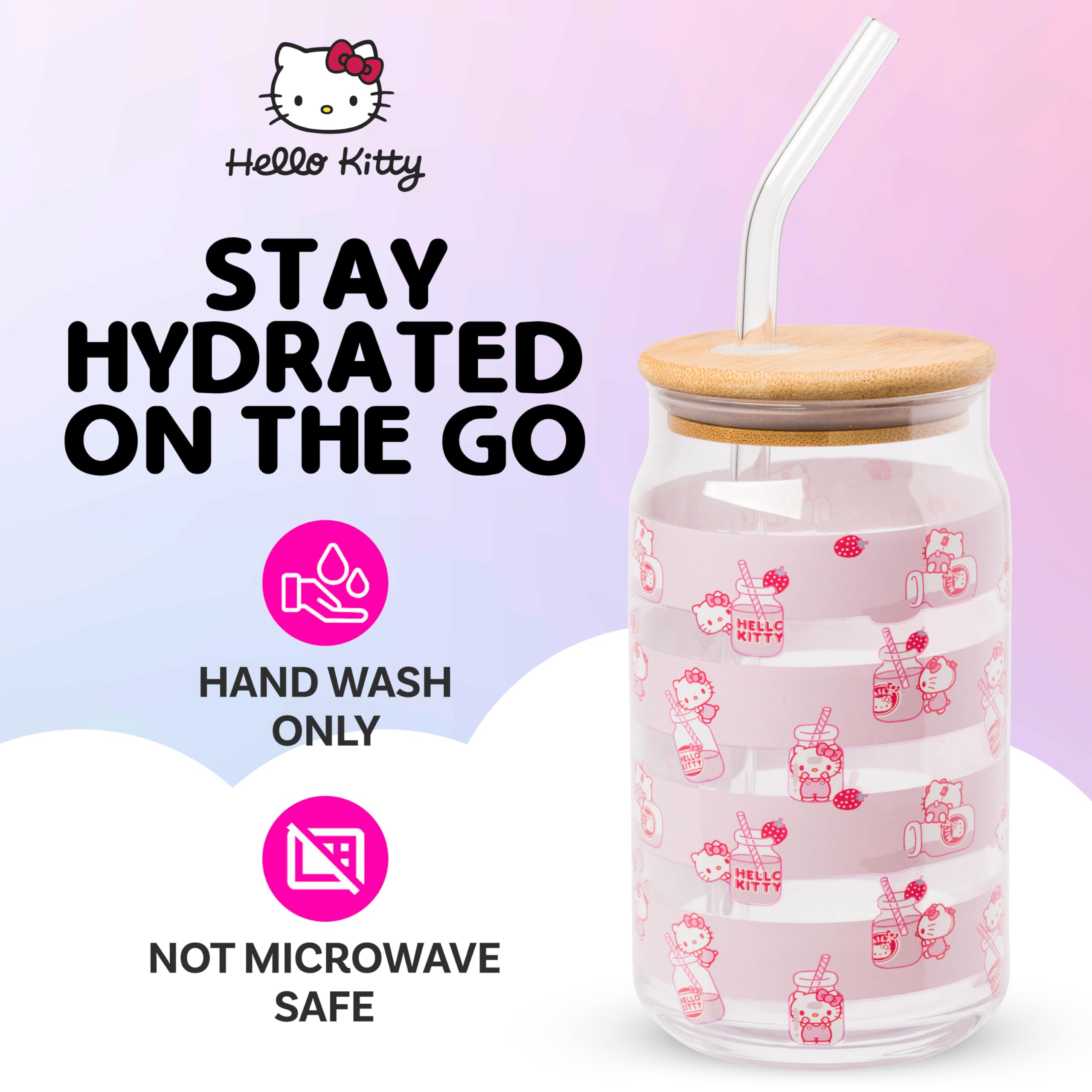 Add a touch of cuteness to your daily hydration routine with the Silver Buffalo Hello Kitty Milk Bottle Toss Glass Tumbler. This 16oz tumbler showcases a playful milk bottle toss design featuring the beloved Hello Kitty, making it a delightful addition to any Hello Kitty fan's collection. Designed for convenience and style, this tumbler includes a secure bamboo lid and a reusable glass straw, perfect for enjoying your favorite beverages whether you're at home or on the go. The natural bamboo lid not only adds an eco-friendly touch but also ensures your drinks stay safely contained during your daily adventures. This versatile tumbler holds 16 ounces of liquid, making it an excellent gift for any occasion, including Christmas, birthdays, or housewarming celebrations. With its charming design and practical features, it's a wonderful present for Hello Kitty enthusiasts of all ages. Embrace a more sustainable lifestyle with the reusable glass straw and make every sip special with this officially licensed Hello Kitty tumbler from Silver Buffalo. Enjoy your beverages with a touch of Hello Kitty magic, one delightful sip at a time! HAND WASH ONLY. NOT microwave safe. Take your fan experience to the next level with Silver Buffalo, a brand dedicated to delivering cherished official character merchandise. Through collaborative efforts, we pioneer unique, creative, and groundbreaking products, with detail and innovation. At Silver Buffalo, our pride lies in crafting extraordinary, playful items that forge a connection between fans and their beloved characters, superheroes, movies, TV series, and beyond. Celebrate your fandom!