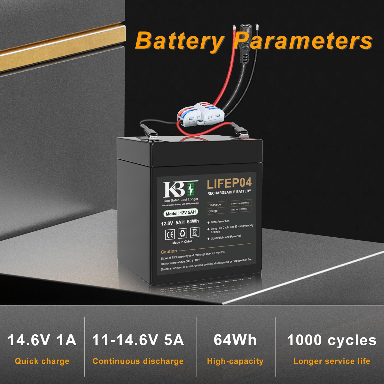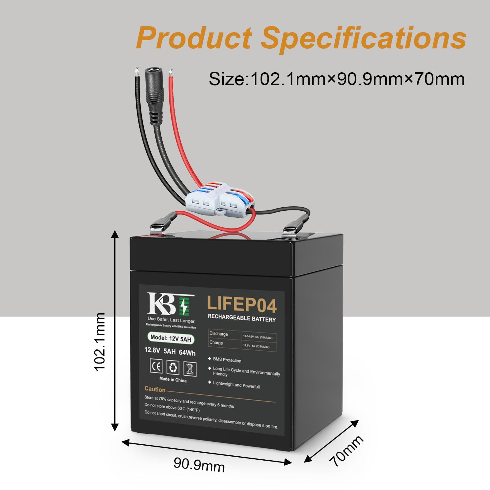 KBT 12V 5Ah Rechargeable Lithium LiFePO4 Battery Pack, Bare Leads Wire Replacement Battery with Charger Compatible with 12V Devices DIY Bluetooth Speaker BoomBox Radio
