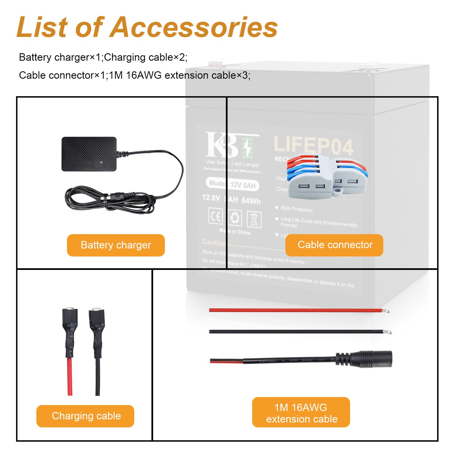 Package includes: 1*12V 5Ah battery pack, 1*12V battery charger, 1* cable connector.
