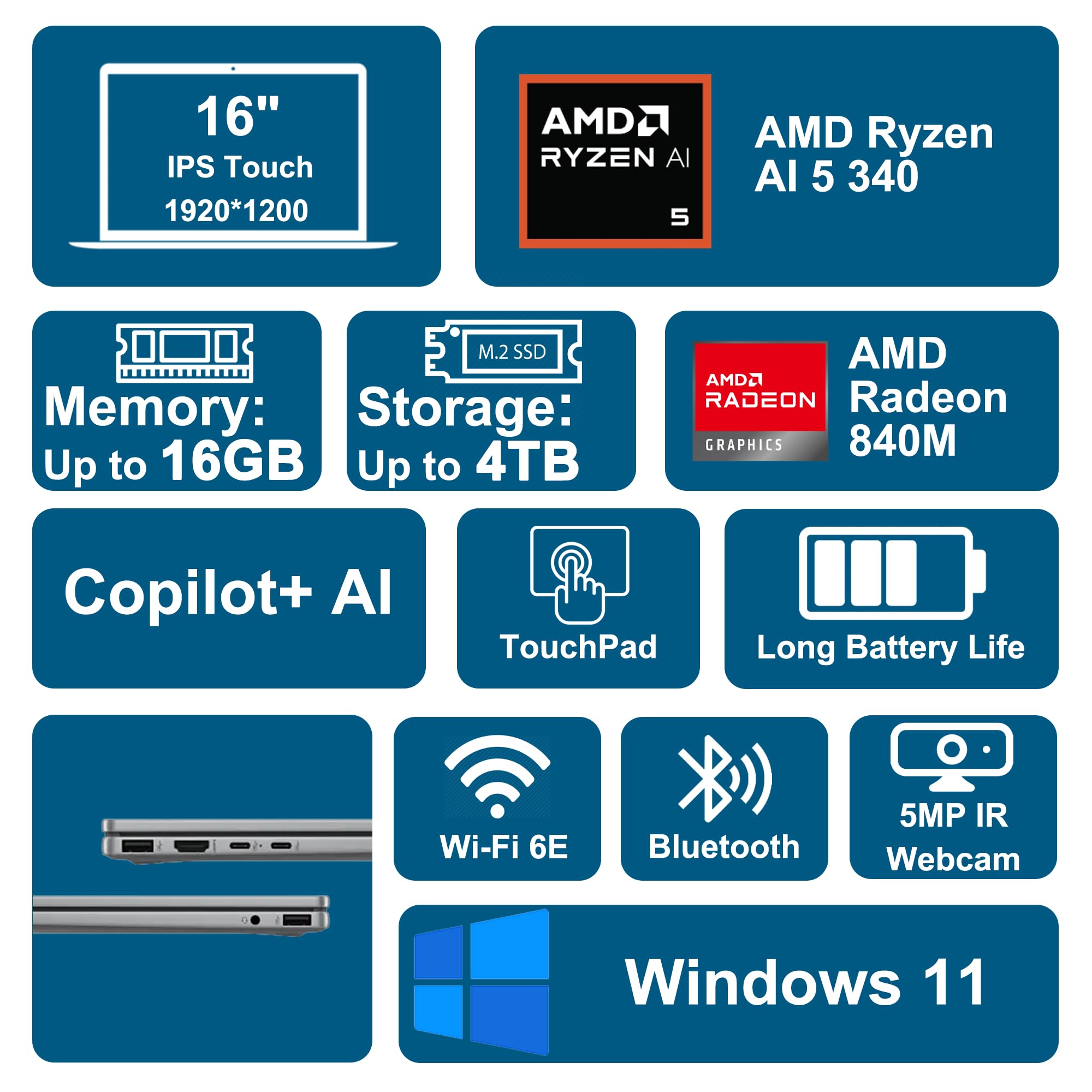 PRODUCT OVERVIEW: Product Details: Microprocessor: AMD Hexa-core Ryzen AI 5 340 Memory: 16GB RAM Storage: 512GB SSD Operating system: Microsoft Windows 11 Home Graphics & Video: Integrated AMD Radeon 840M 16" WUXGA (1920x1200) IPS Touchscreen (400nits) Key Features: Backlit Keyboard: Yes Poly Studio: Yes DTS:X Ultra: Yes 5MP IR Privacy Camera: Yes Wi-Fi 6E: Yes Ports: 2x SuperSpeed USB-A, 2x SuperSpeed USB-C, 1x HDMI 2.1 Battery: 68Wh Additional Information: Dimension: 9.67" x 14.02" x 0.61" Weight: 4.18 lbs