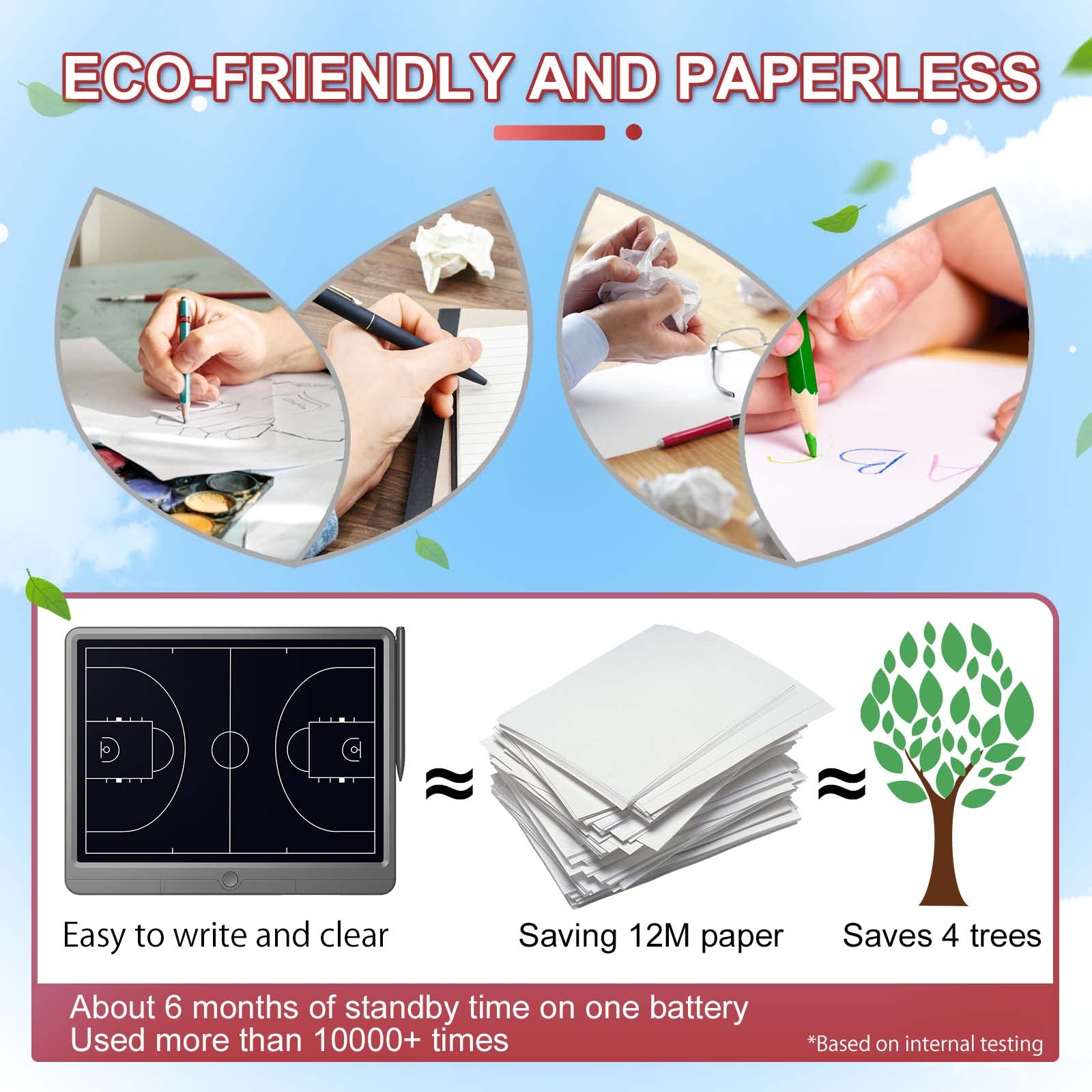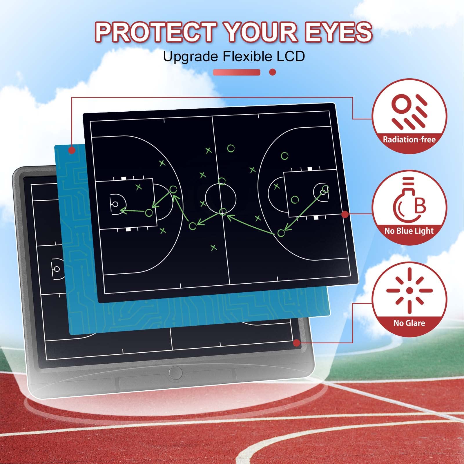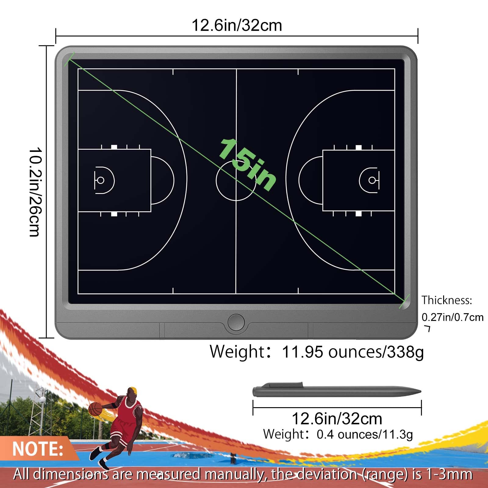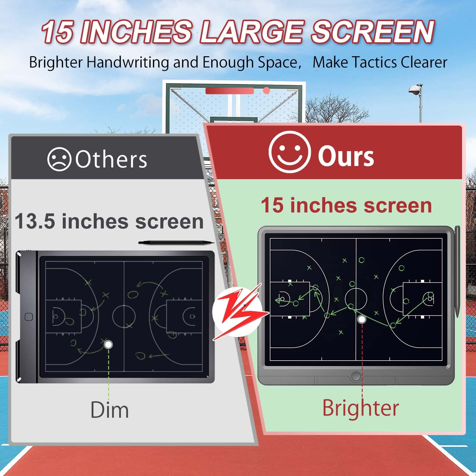 15 inches Large flexible LCD display that provides enough space to draw up basketball plays, half court, full court sets and player matchups. Reusable coaching board, which can be erased up to 100,000 times.