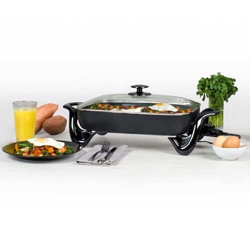 Roast, fry, grill, stew, bake, and make casseroles in this stylish Presto® Electric Skillet. Its 16-inch pan with high sidewalls offers extra cooking and serving capacity for large family meals and entertaining. The tempered glass cover with stay-cool handle allows it to double as a convenient buffet server. Durable ceramic nonstick surface, inside and out, is PFAS free and provides stick-free cooking and easy cleaning. An adjustable Control Master® heat control maintains cooking temperatures automatically. Saves energy too—it’s more efficient to use than a range burner or oven. The heavy cast aluminum base is virtually warp-proof. The skillet is fully immersible with the heat control removed.